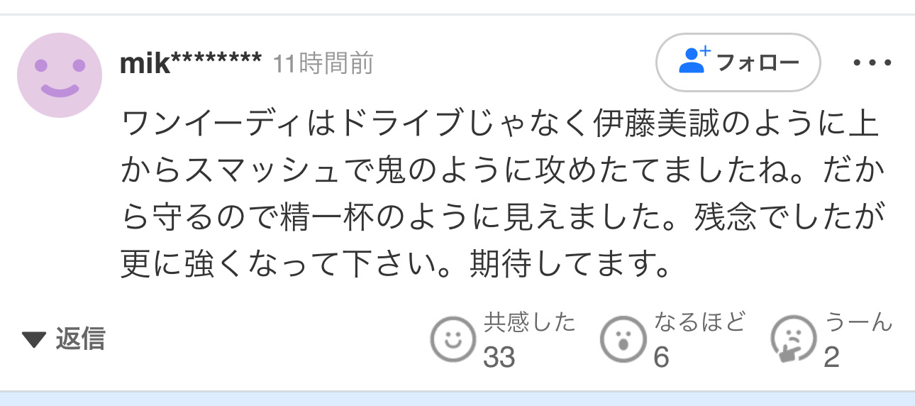评论2:王艺迪确实变强了。毕竟是世界排名第三的实力。