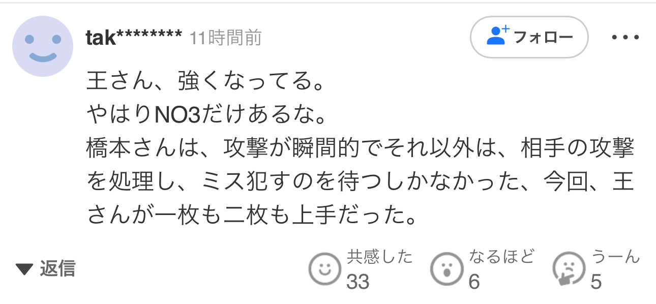 桥本选手的攻击虽然瞬间很快,但其余时间只能处理对手攻击、等待对手失误。这次,王艺迪明显比桥本高出一两层。