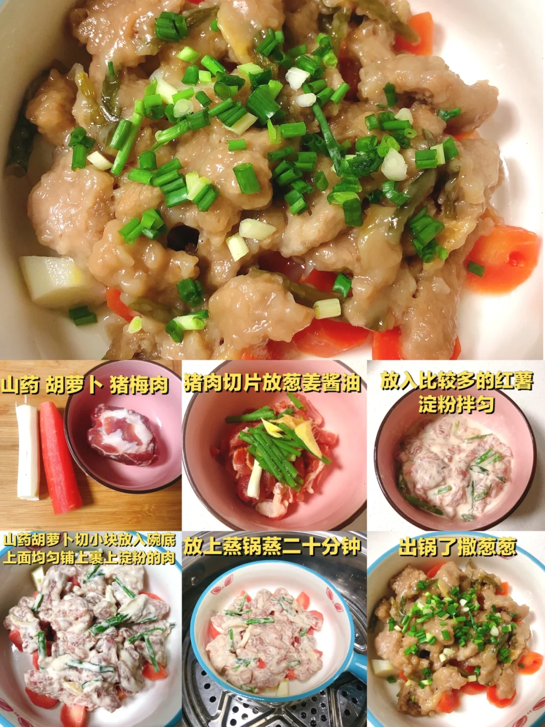 3⃣️碗内放胡萝卜🥕山药、再把裹了淀粉的肉均匀铺在菜上面,上锅蒸二十分就好了