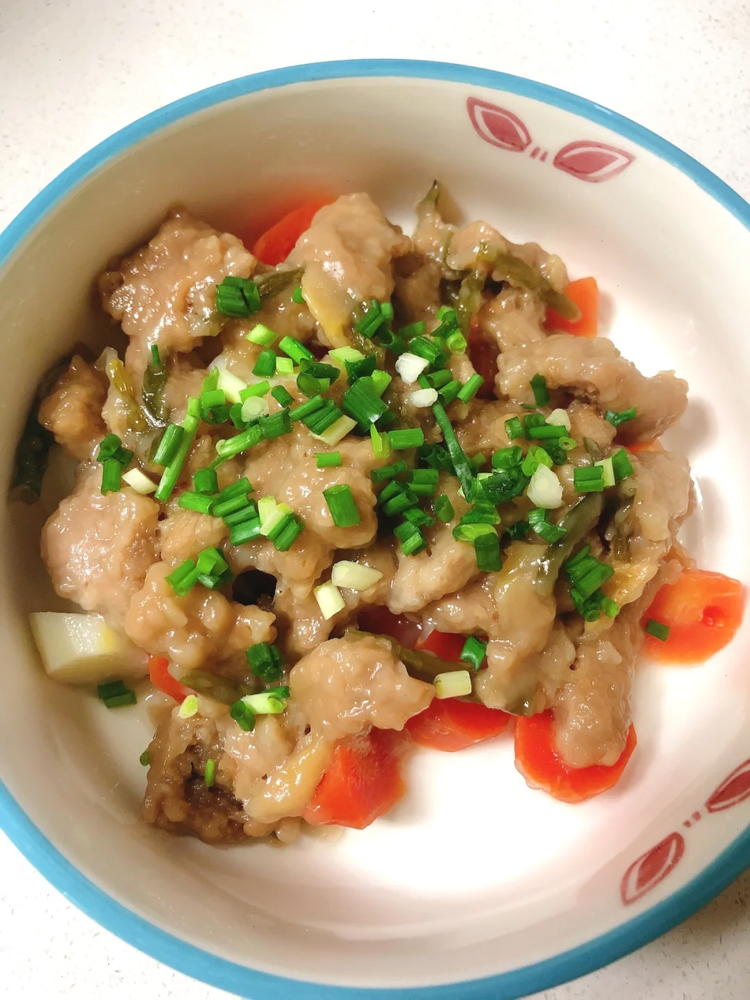 2⃣️猪肉用葱姜酱油码十来分钟然后加入红薯淀粉(玉米淀粉也🉑️)