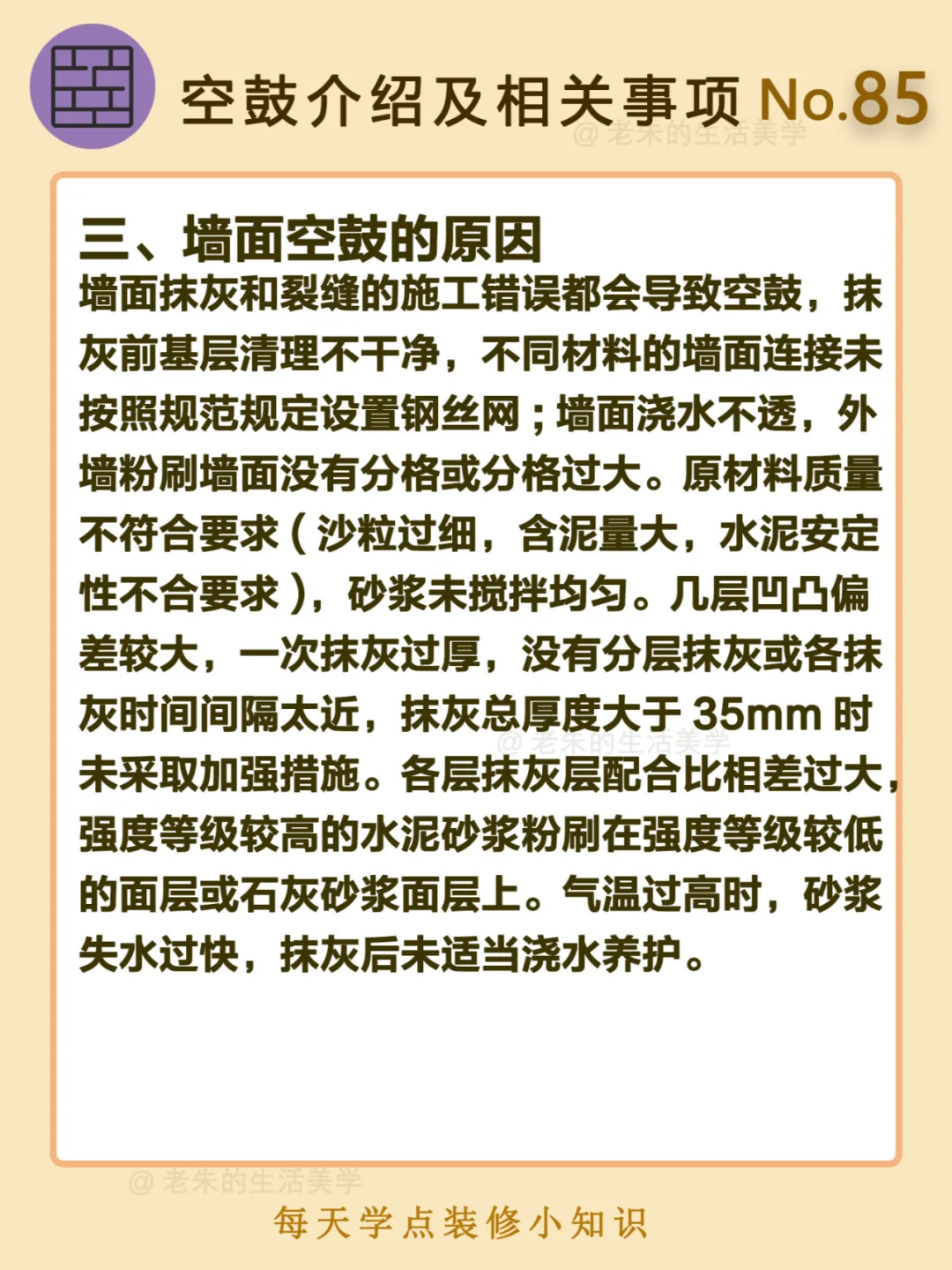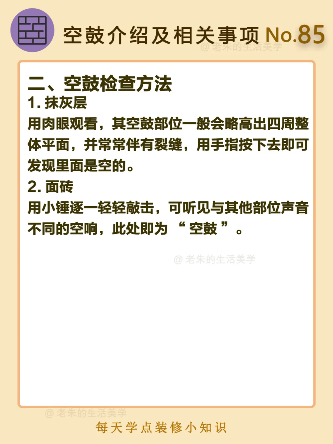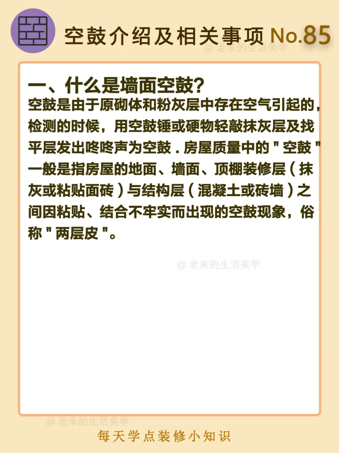 🔔 一、什么是墙面空鼓? 二、空鼓检查方法 三、墙面空鼓的原因 四、墙面空鼓的危害 五、墙面空鼓怎么处理 🔆 我是老朱 📍坐标天津 前上市公司金牌工长🏅 30年施工经验🛠️ 承接天津新房装修/老房改造 精心整理关于设计&施工&装修的攻略📝 关注我每日更新🗓️ 也可以在评论区留下您宝贵的想法与建议💓 让您装修不走弯路✅