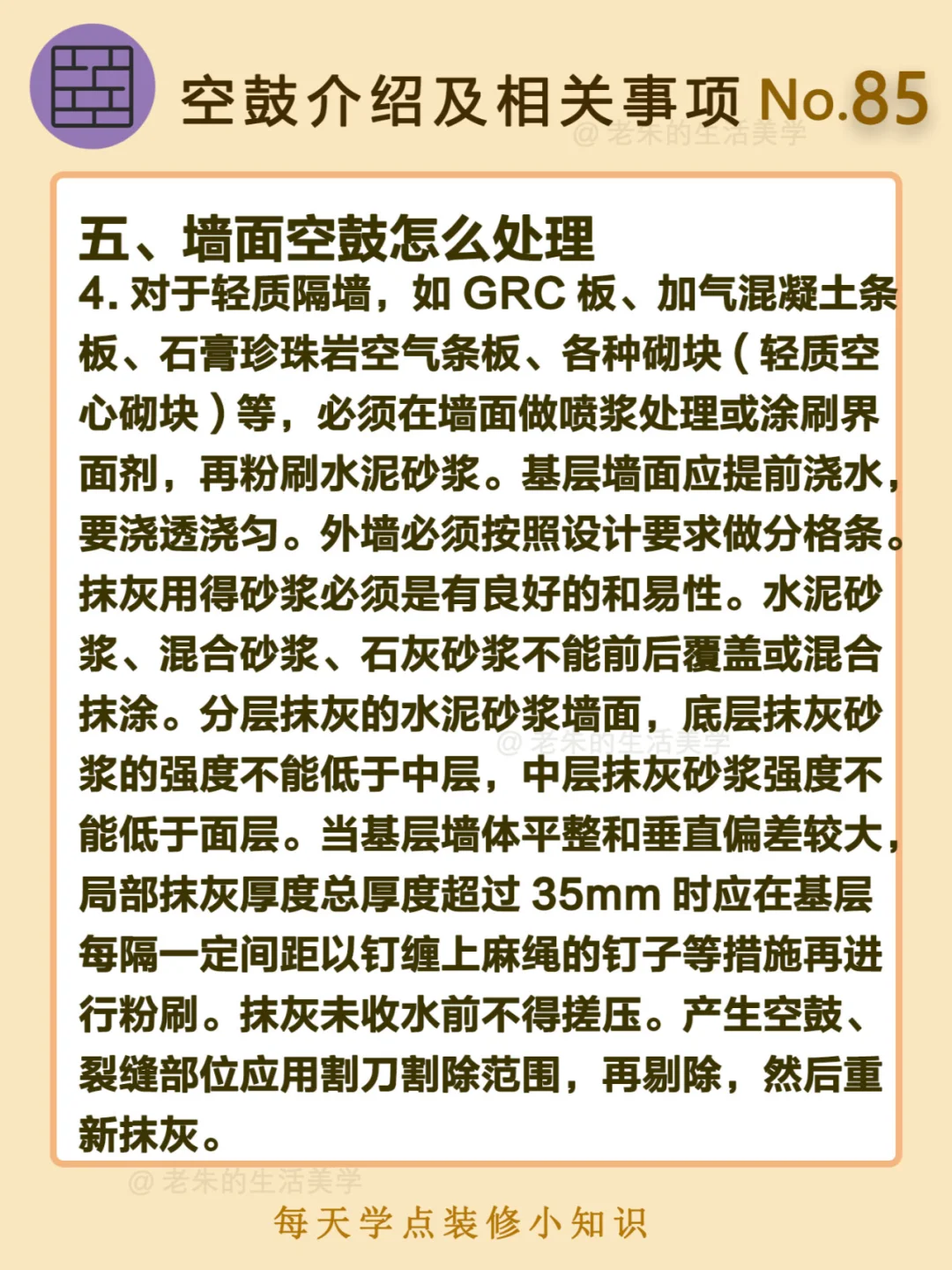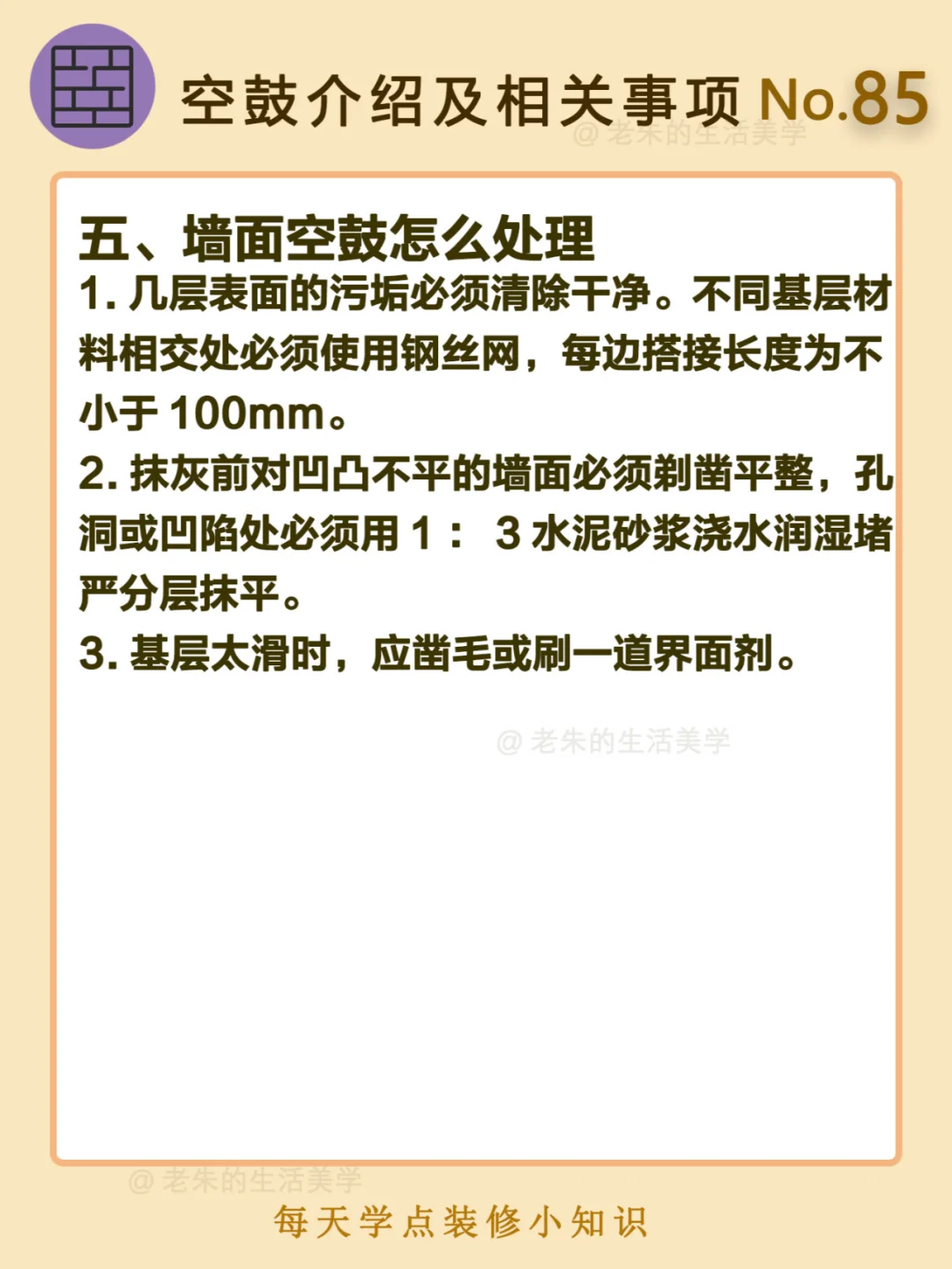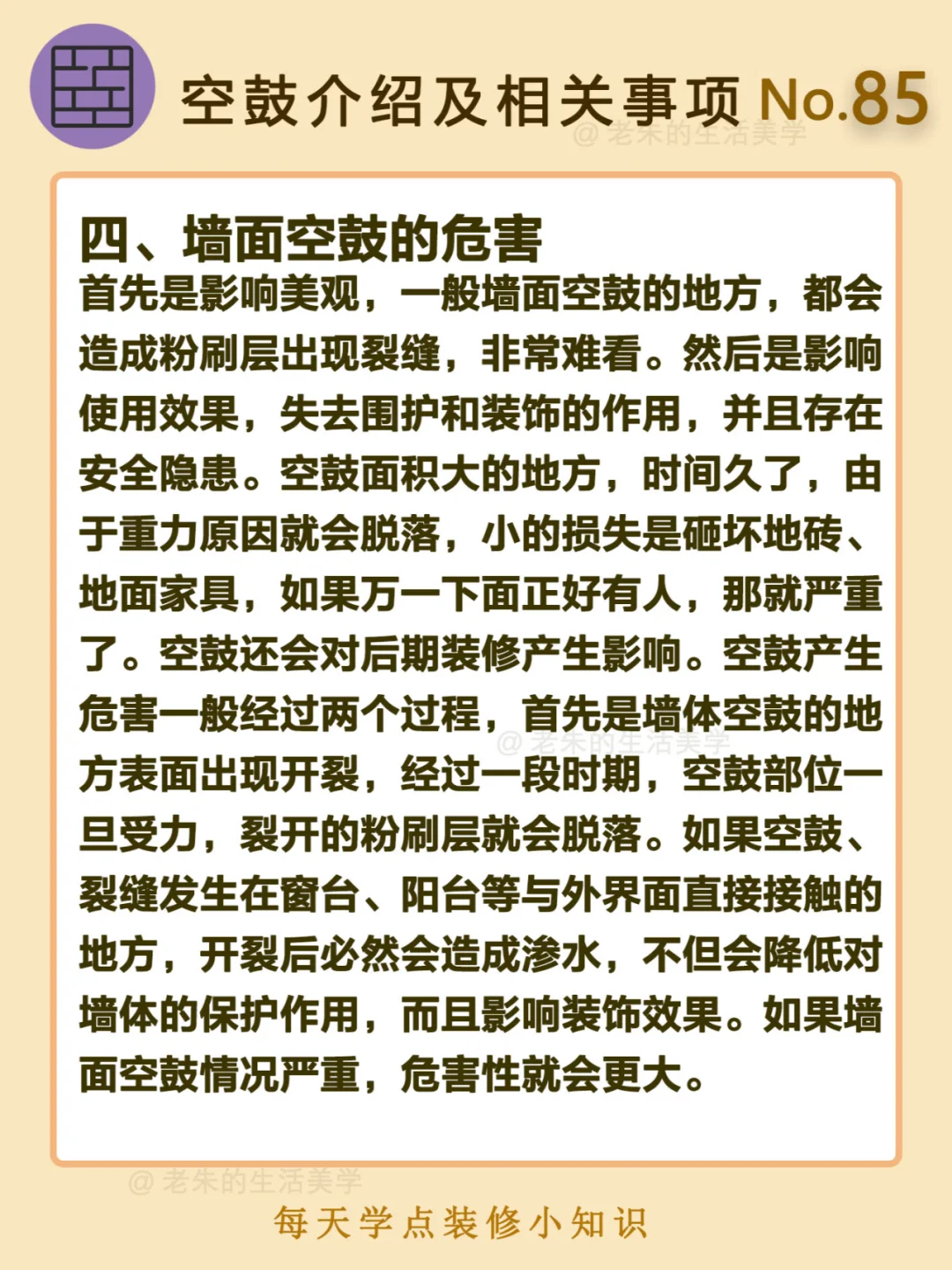 🔔 一、什么是墙面空鼓? 二、空鼓检查方法 三、墙面空鼓的原因 四、墙面空鼓的危害 五、墙面空鼓怎么处理 🔆 我是老朱 📍坐标天津 前上市公司金牌工长🏅 30年施工经验🛠️ 承接天津新房装修/老房改造 精心整理关于设计&施工&装修的攻略📝 关注我每日更新🗓️ 也可以在评论区留下您宝贵的想法与建议💓 让您装修不走弯路✅