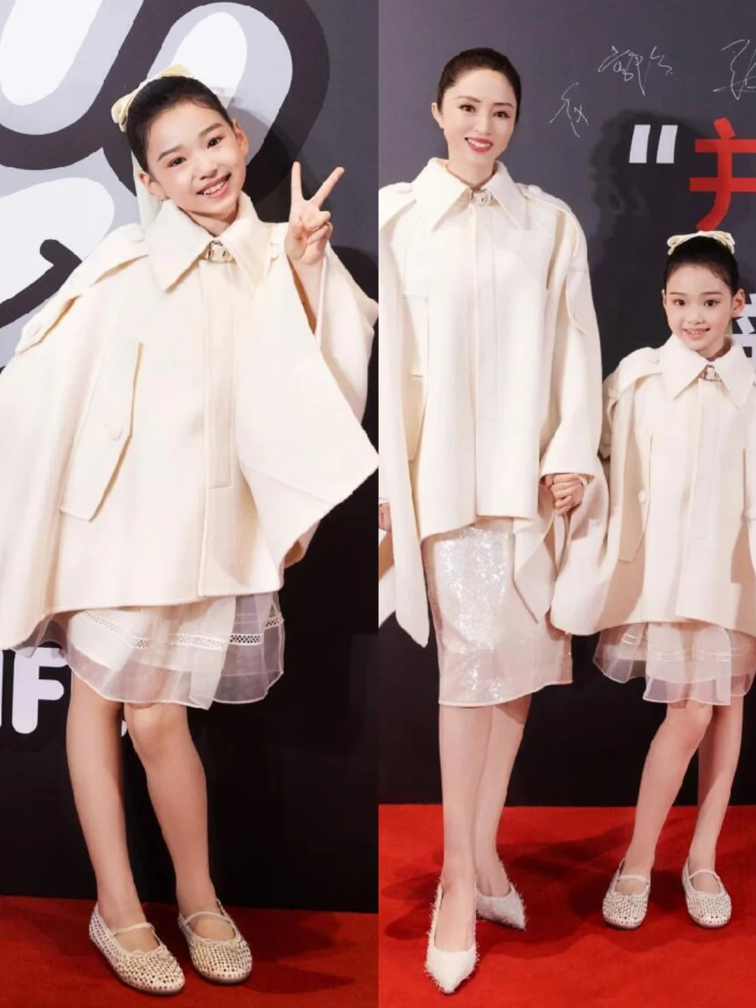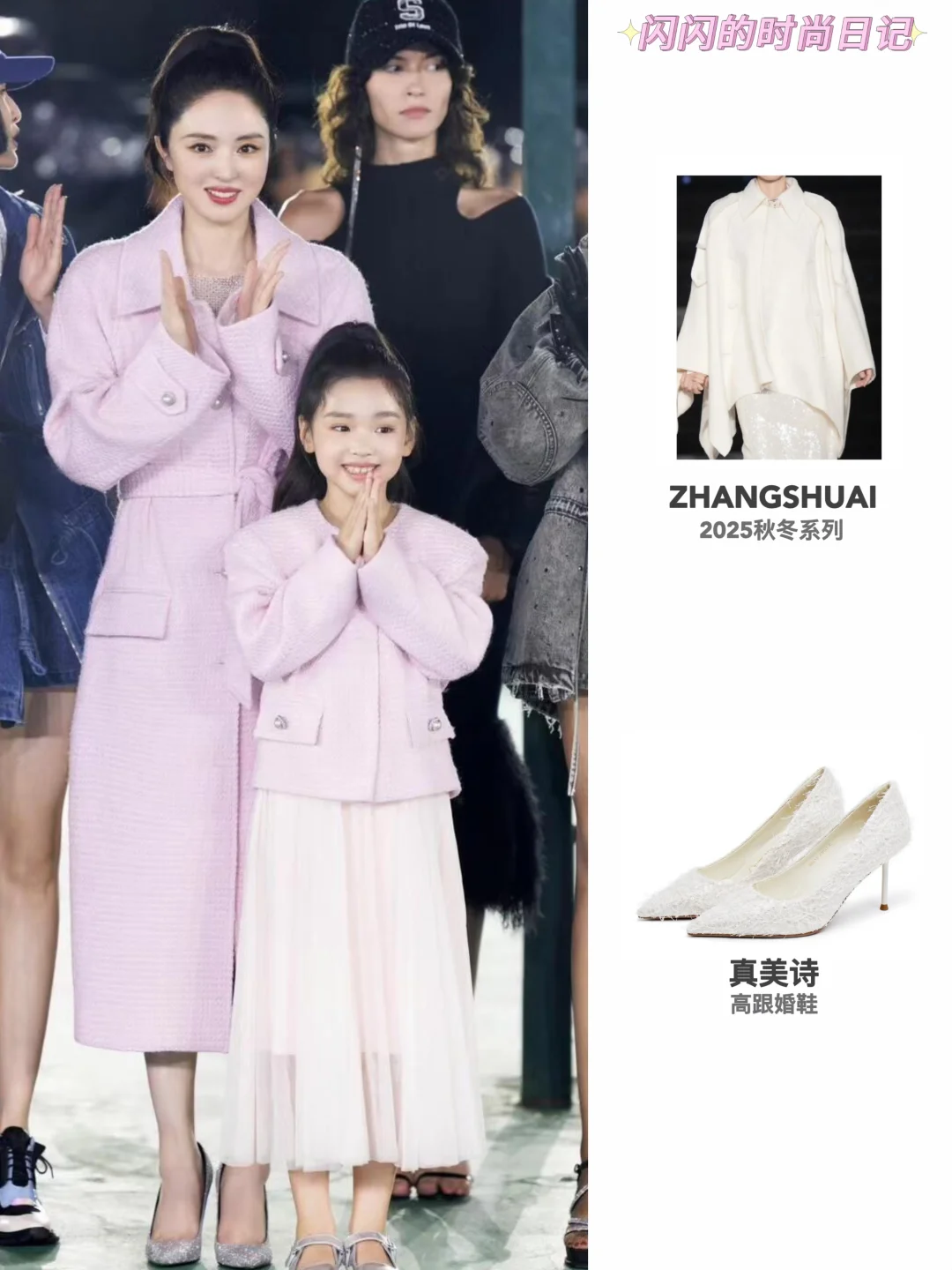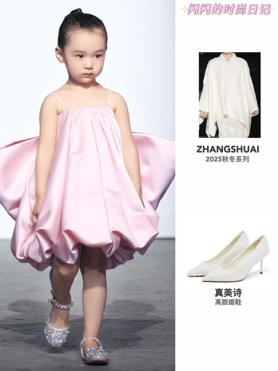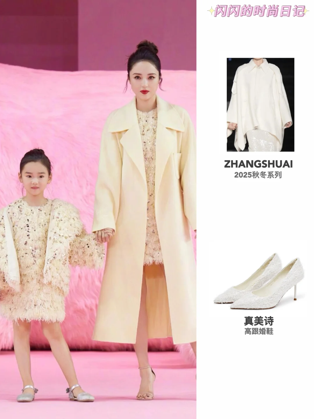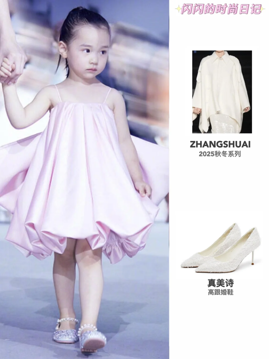才知道小酒窝三岁就登上T台为品牌走秀啦!后来又和妈妈一起走了好几次,现在看她三岁的时候还有点拘谨,现在九岁了已经游刃有余了!和妈妈穿着同款斗篷上衣,简直就是缩小版董璇!璇姐的鞋子也好漂亮,简单大气,还是一双婚鞋!