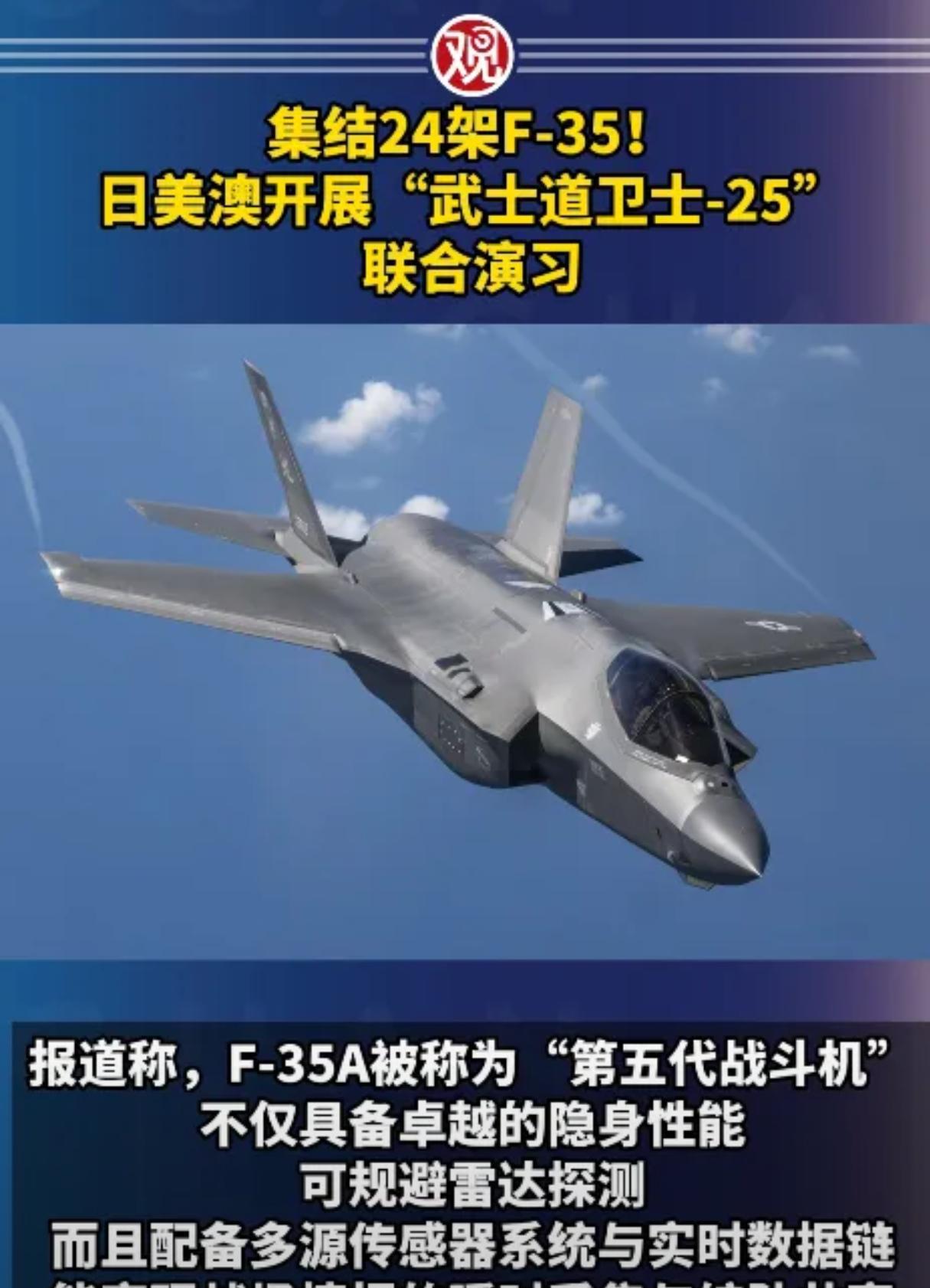 怪不得我们这个时候报道歼16驱逐五代机,原来美日澳有大动作了 10月2号当天,我们的权威媒体在一档专题栏目中提到了我们的歼16战斗机在沿海空域驱逐外军隐身机的事情。 这次事件发生的时间实际上是2024年,歼16重型战斗机近距离接近对方的隐身机后,一个桶滚动作直接压住了对方,同时锁定了两款隐身机。面对这种情况,对方的隐身战斗机迅速撤离,从此再也没有出现在相关海域和空域过。 在我国周边海域出现的隐身战斗机肯定是5代机,基本上能确定就是美国人的F35!而从10月1号当天日本方面公布的一则消息来看,似乎就能理解我们的权威媒体为什么选择在10月2号专门通过栏目把去年的事情公布出来了。 9月29号到10月10号这几天,日本,澳大利亚和美国这三个国家将会在青森县三泽市的日本航空自卫队的三泽基地展开代号为武士道卫士25的联合演习。而这次演习中,将会集结最精锐的F35A隐身战斗机,日本媒体声称这种隐身战斗机不仅具备卓越的隐身性能,还可规避雷达探索,有极强的战场感知能力。反正就是一味的吹嘘。 他们的演习才刚开始,中国就公布了歼16暴揍隐身机,这等于直接打脸了F35。这个时间点选择的确实非常的巧妙!