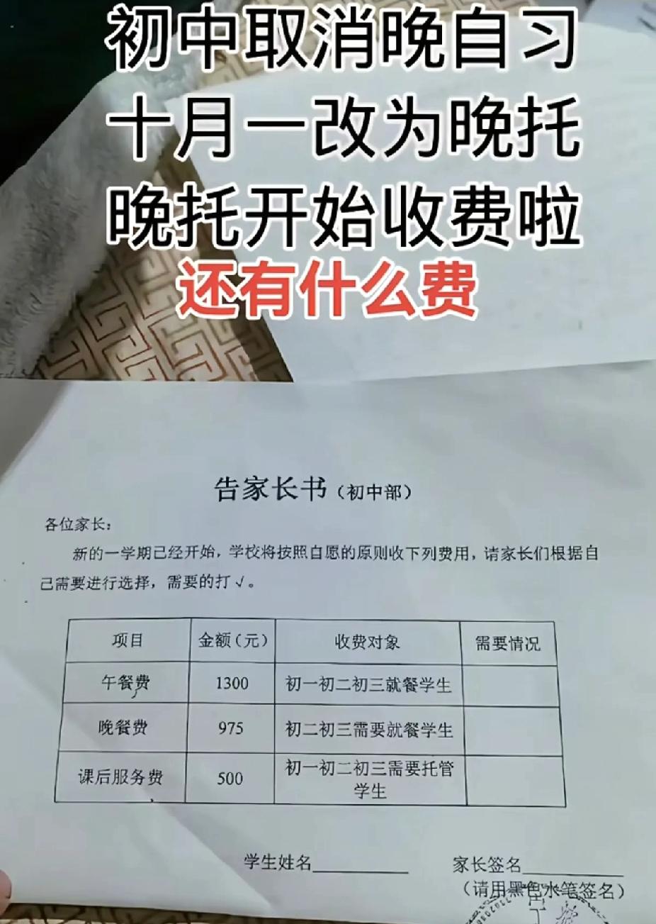 多地国庆后,将取消晚自习 10月1日后,山东潍坊、江苏淮安、云南昆明等地初中部将正式取消晚自习。取消晚自习进而将推出市场化晚托服务,并会收取一定的费用。这一政策估计会在家长群炸开锅,因为原先晚自习是不收费的,现在更名为晚托服务就要开始收费了。 估计接下来有人会为取消晚自习而欢呼,当然也有人会因为晚托服务和孩子晚上时间的管理而担忧。取消晚自习是好还是坏,我也不能过多的评价,什么事情都有两面性。我个人觉得,取消晚自习而进行晚托服务,此举可以理解为变相收费,虽然官方会以自愿的形式进行发布。学校名为自愿,但哪个家长不会参加,除非学校晚托服务只为将孩子的作业进行到底,不要借用晚托之名进行上课,那家长应该就不会有所顾虑。 在山东潍坊非寄宿制学校初中已全面取消晚自习,学生下午6点就可以离校;云南昆明的政策更具有弹性,允许学校根据家长的需求,提供“晚托+晚自习”双规服务,但明确非寄宿学校不允许统一安排晚自习。根据这些学校的说法,取消晚自习是把课后时间家庭,让孩子有机会参与亲子互动,进而培养孩子的兴趣爱好。 此次针对初中晚自习的调整,其本质应该是让义务教育的孩子减轻额外的教学负担,让教学真正回归课堂。本身这个晚托就应该是以作业管理为主、兴趣拓展为辅,而现在的有些老师过多的占用学生的晚托时间,让学校的晚托失去了本来的意义,同时也让家长对晚托服务的意义失去了信心。 初中取消晚自习,其主观目的还是想为孩子的学习减负,让孩子有更多的休息时间。比如孩子早点回家,能有更多的时间完成作业,至少能够提前1个小时睡觉。我觉得从这点来说,取消晚自习就有一定的意义。话说回来,很多家长又会担心孩子缺少了一些学习的时间,学习是孩子的事情,作为家长干着急也是没用的,所谓学习认真的同学,不管在哪种条件下依然能够学的好;取消晚自习,孩子回家可以有更多的自我反省时间,也确实增加了一些亲子沟通的机会。 总之,取消晚自习增加晚托服务,这个事情的两面性太强了,那随之而来的争议肯定也很多。部分地区把晚托纳入财政支出,这样让政策的实行既有温度又有尺度。 希望这场教育改革能真正惠及每个孩子,每个家庭。你们支持取消晚自习吗? 中小学生晚自习 取消初中晚自习 取消晚自习 自愿晚自习 取消高中晚自习 废除晚自习 初中晚自习 高一晚自习 宁波取消晚自习 宁海取消晚自习 重庆取消晚自习 郑州取消晚自习 宁波晚自习 青州晚自习 昆明晚自习