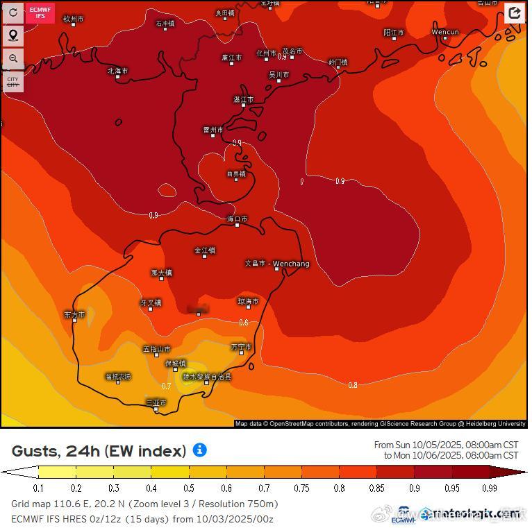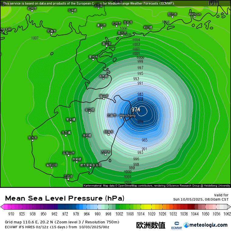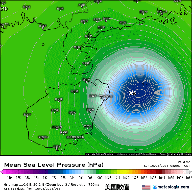 欧洲数值预报,5日上午先登陆文昌,下午再登陆徐闻。美国数值预报给出擦过文昌,5日下午登陆广东徐闻-雷州之间。由于未来台风路径前进方向是西偏北,与目前台风位置连线,正好几乎压在海南东北部海岸线,因此最后登不登文昌,需要临近根据文昌一带站点风场变化才能判定。