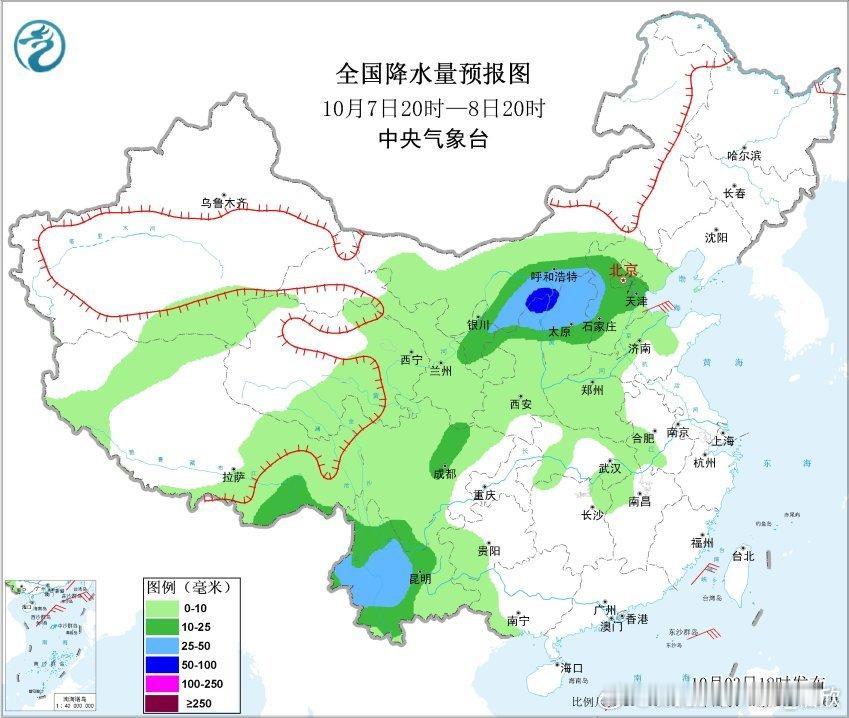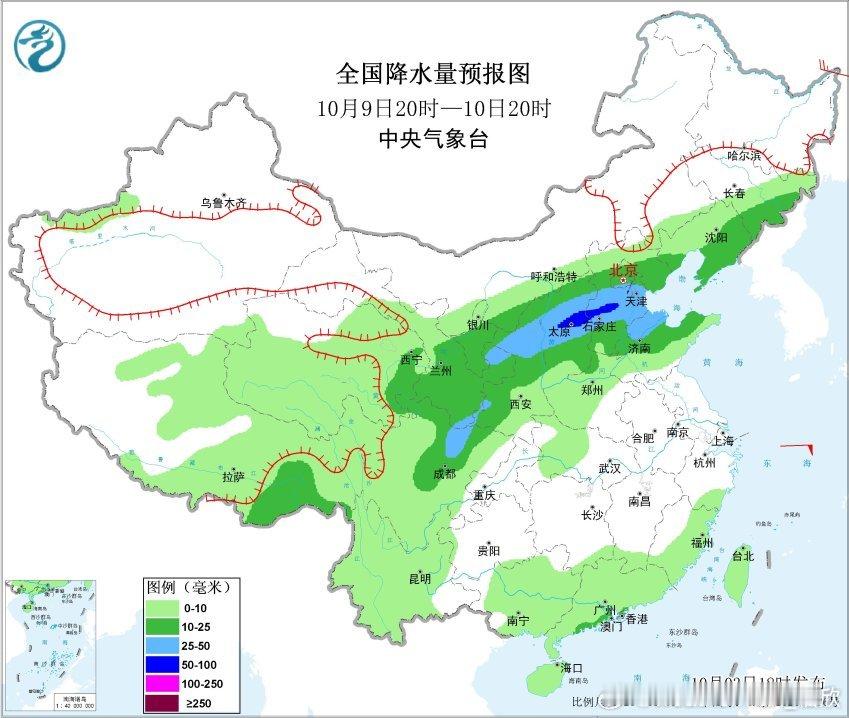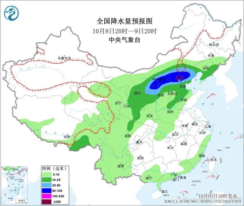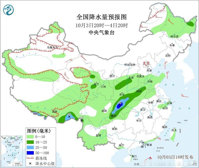 预计10月3日20时至4日20时,黑龙江东北部、西藏南部、青海东部和北部、甘肃东部、陕西北部和东南部、河南中部和西南部、湖北西部、四川盆地东部等地部分地区有中到大雨,其中,四川盆地东北部等地部分地区有暴雨(50~70毫米)。