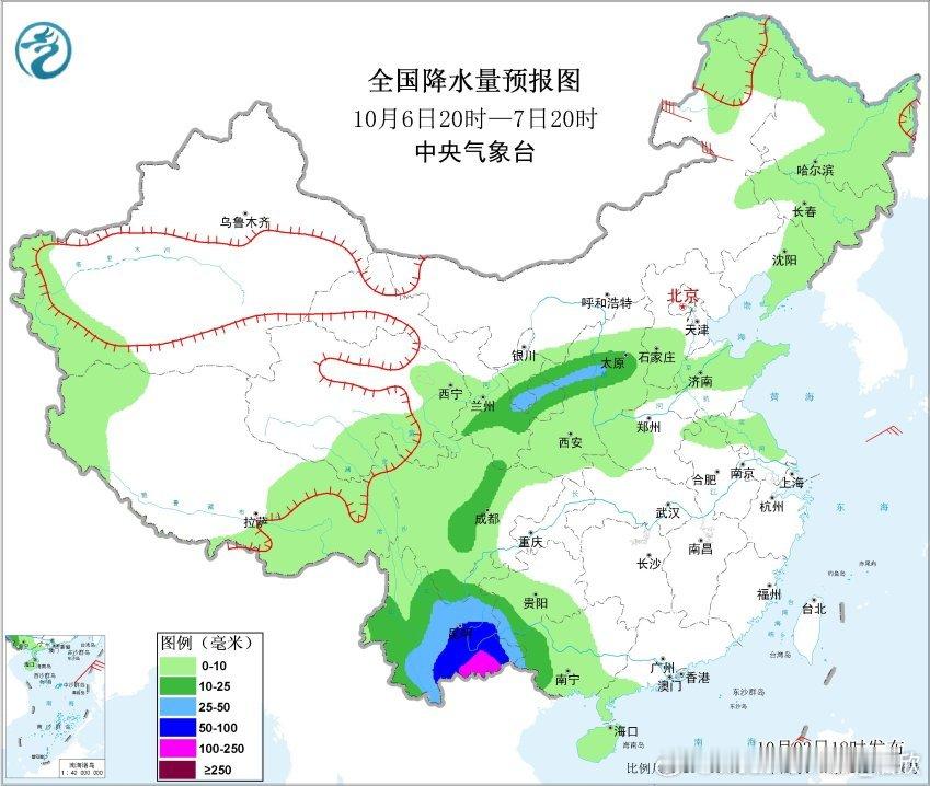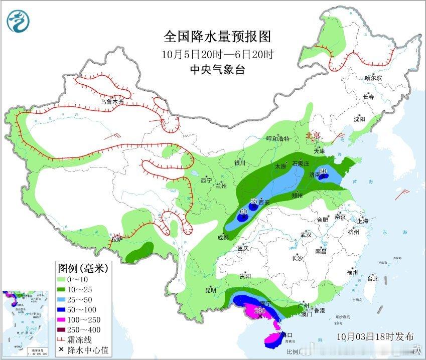 预计10月5日20时至6日20时,西北地区东部、华北中南部、黄淮及西藏东南部、四川盆地等地有中到大雨,其中,陕西南部、四川盆地东北部和山东中部等地有暴雨;此外,广东西南部、广西南部和海南岛有暴雨或大暴雨(100~230毫米)。