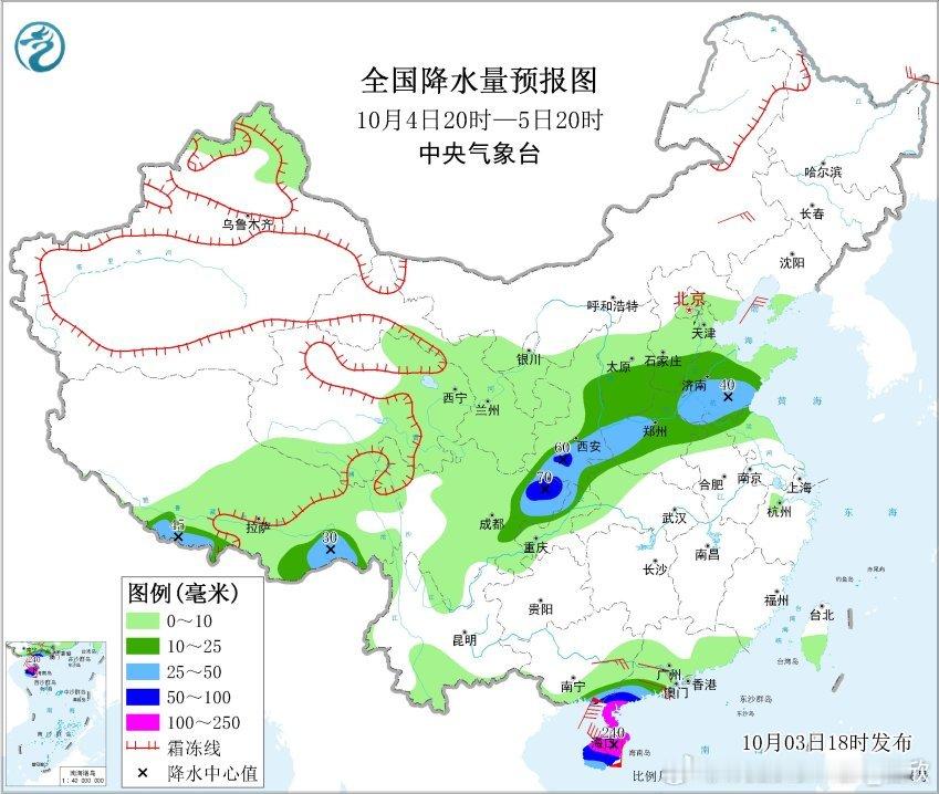预计10月4日20时至5日20时,陕西东部和南部、华北中南部、黄淮、西藏南部、四川盆地中东部、广东西南部、广西东南部、海南岛等地有中到大雨,其中,陕西南部、四川盆地东北部、广东西南部、广西东南部、海南岛等地部分地区有暴雨或大暴雨(100~240毫米)。