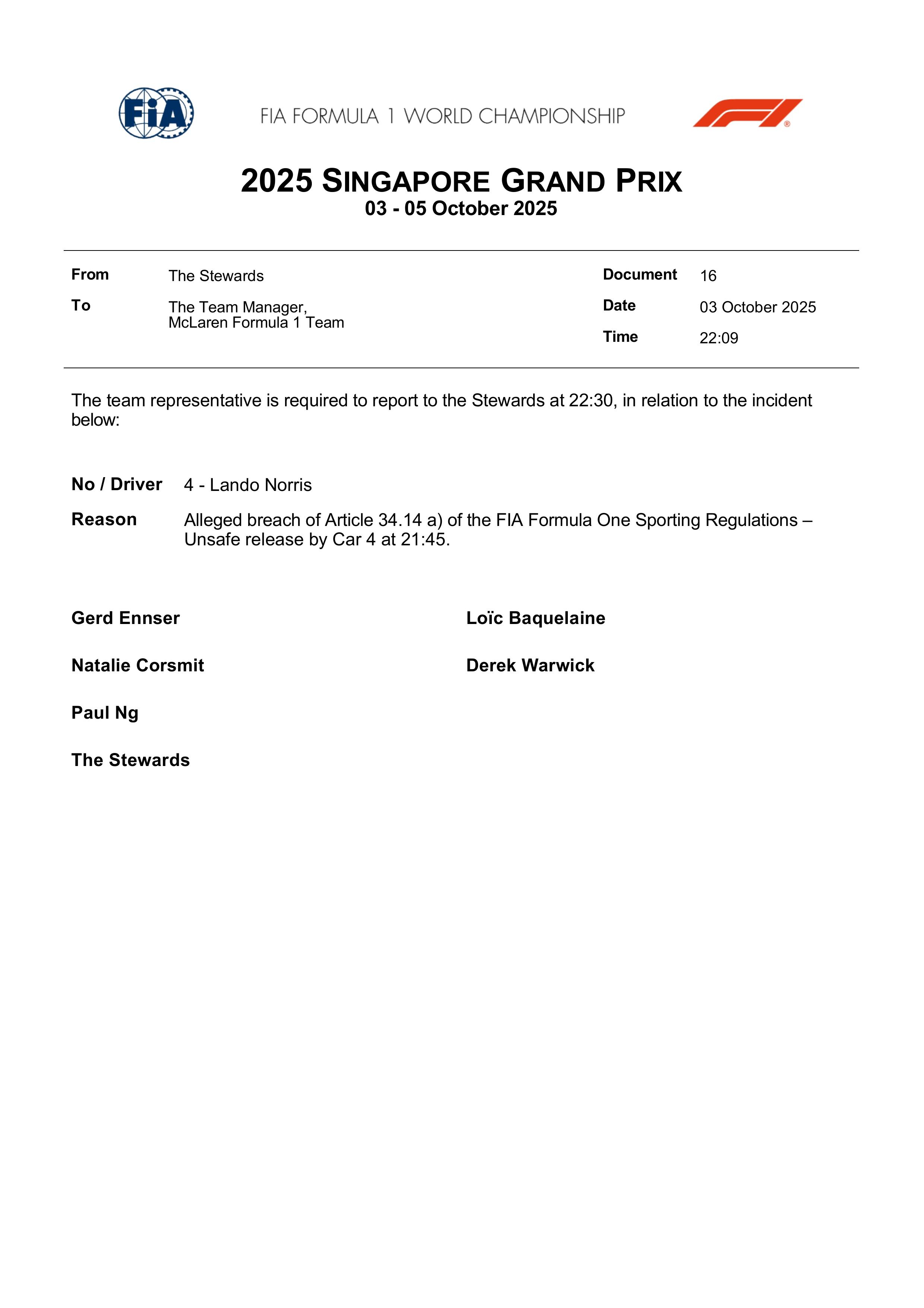 勒克莱尔、诺里斯以及相关车队代表因二练中的非安全释放被赛事仲裁传唤。F12025