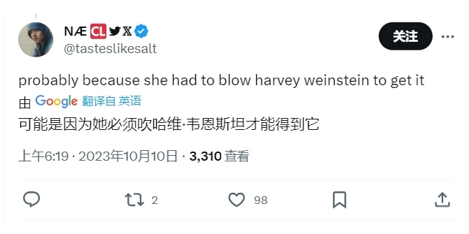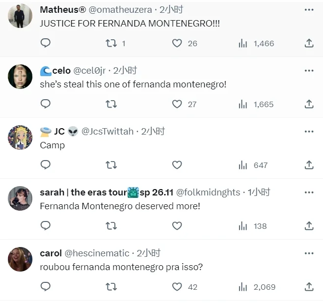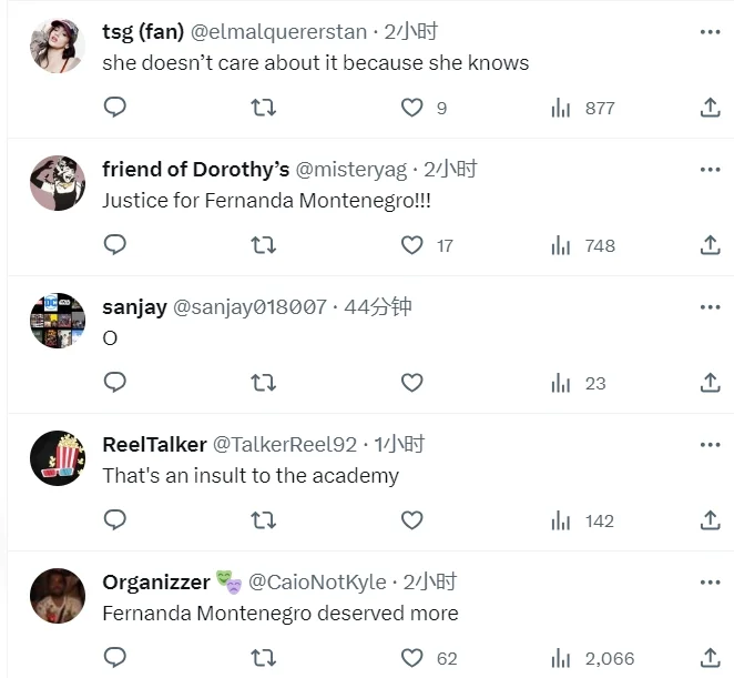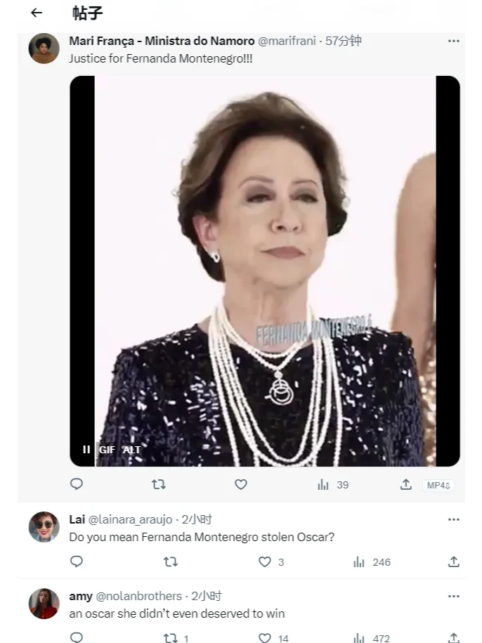 但是,更多网友则是为巴西女演员Fernanda Montenegro打抱不平,认为她本身就不配拿奥斯卡,有网友表示“考虑到她本身就不配获得奥斯卡,这也算是物尽其用了”。