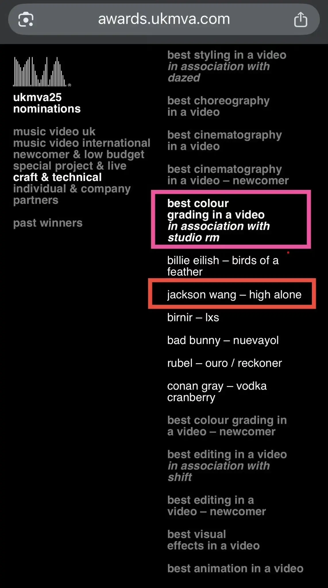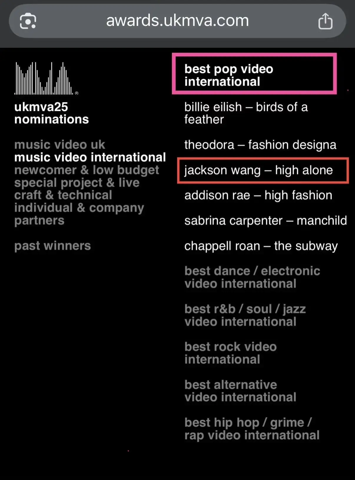 恭喜🎉🎉🎉。王嘉尔HighaloneMV获英国MVA提名❤️