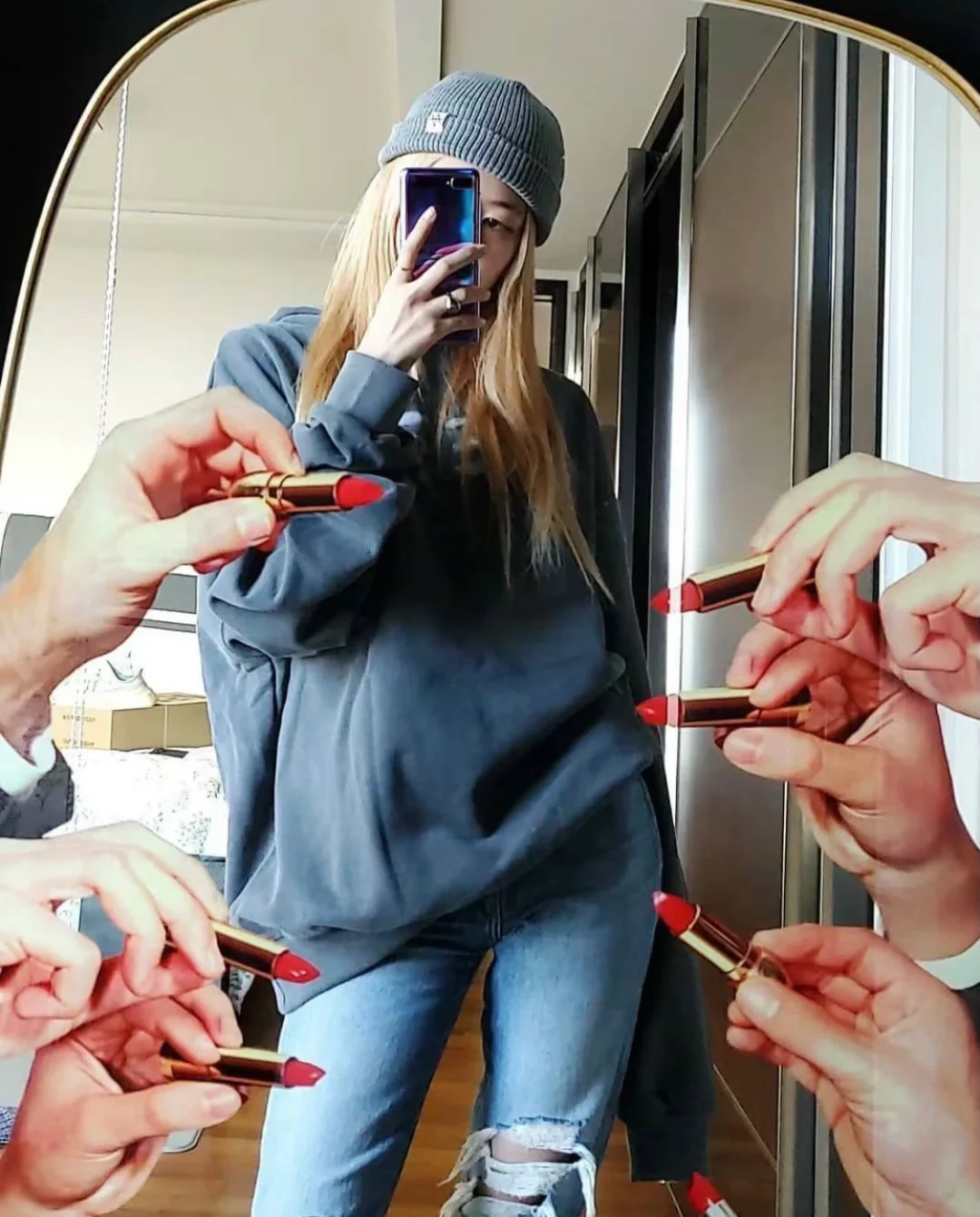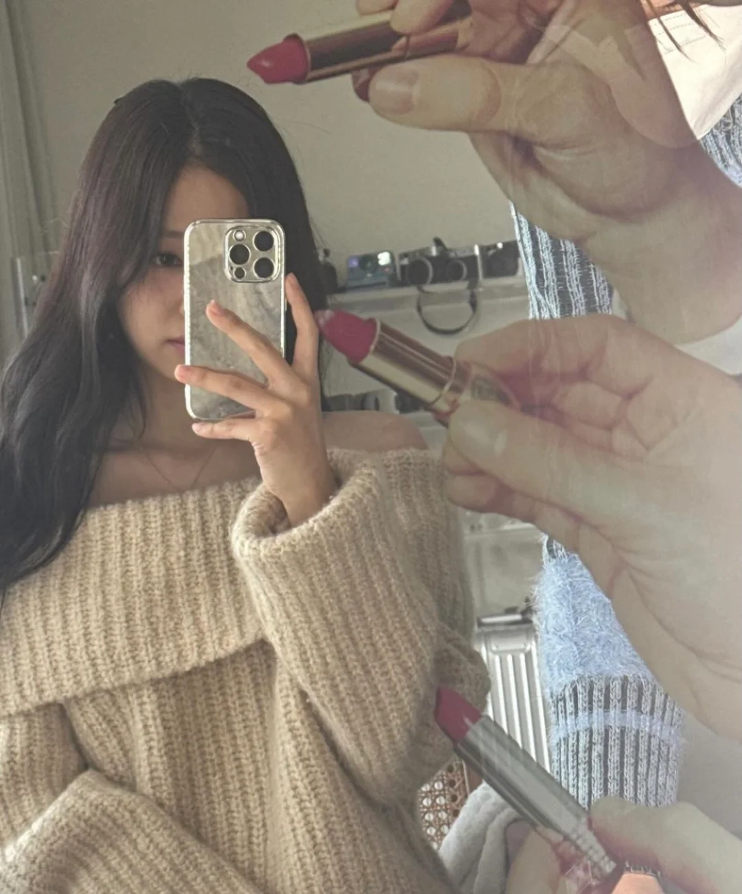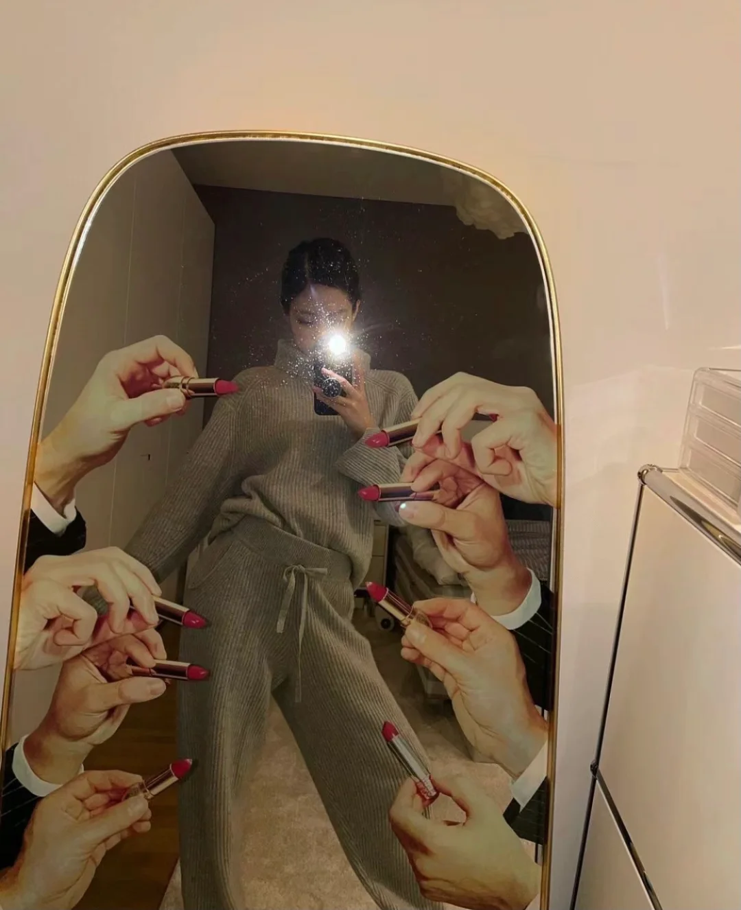 Jennie昨晚惊喜发布《Snow/Snowman》,还po了一张对镜自拍,曾红极一时的“口红镜”再度入镜,看得出是妮的挚爱自拍镜了,出场好几次。