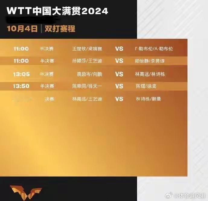 wtt中国大满贯10月4日赛程 今日中国大满贯乒乓赛事。期待中国球员都能取胜,加油!wtt[超话]