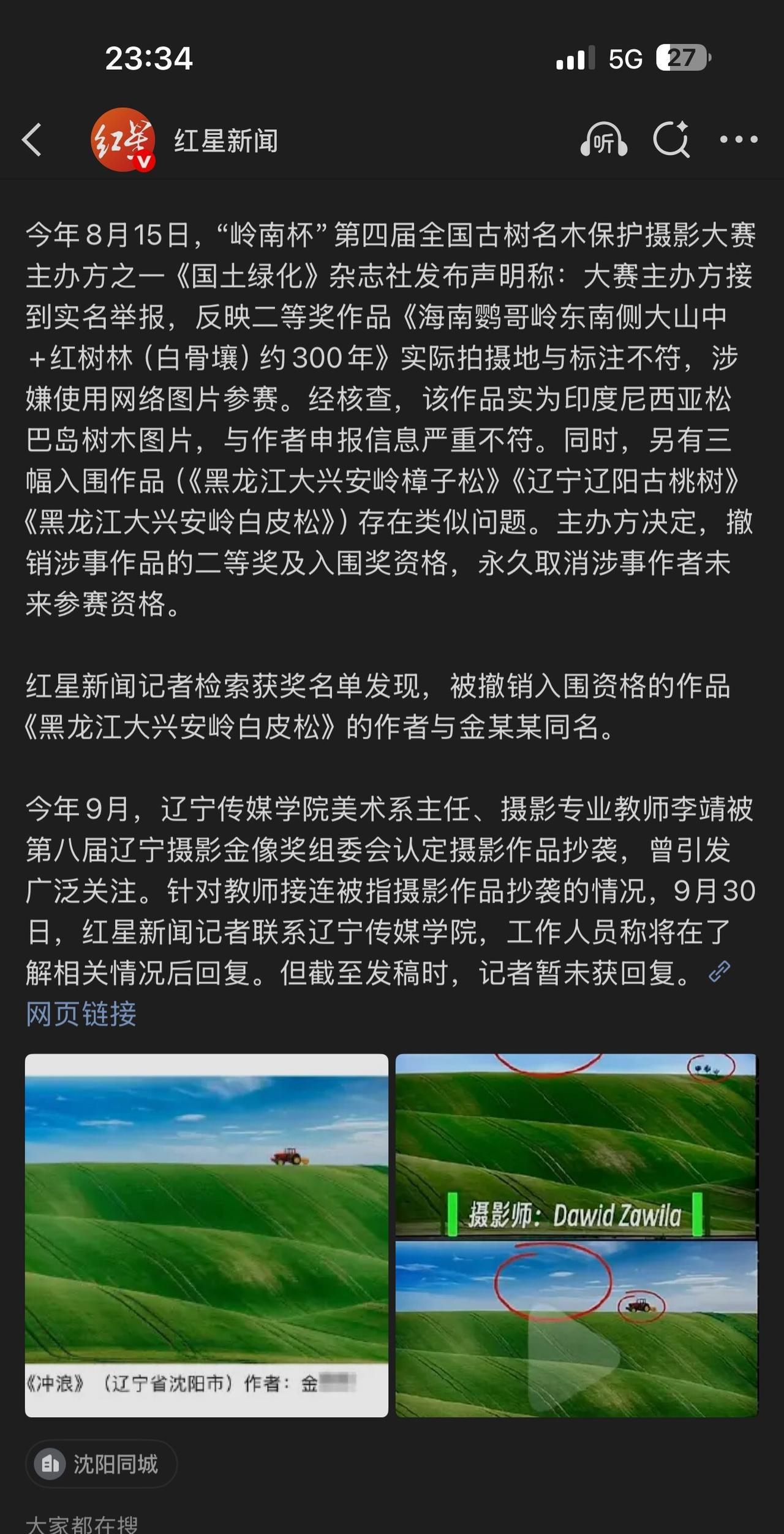 辽宁某传媒学院又涉嫌学术不端,这离上次系主任出问题才没多久呢。事情是这样的,上月中该学院美术系主任李某因实锤摄影作品抄袭被处罚,”。这才过去不到20天该学院老师金某又被指涉嫌摄影作品剽窃,通过作品对比在我看来金老师这张作品的确是剽窃了,搞不好就是直接PS操盘的。当然在理论上来讲是有可能拍摄出高度类似的作品的,但条件极其苛刻。如果金老师要证明自己是实拍的也很简单,拿出原片即可。 #万能生活指南#