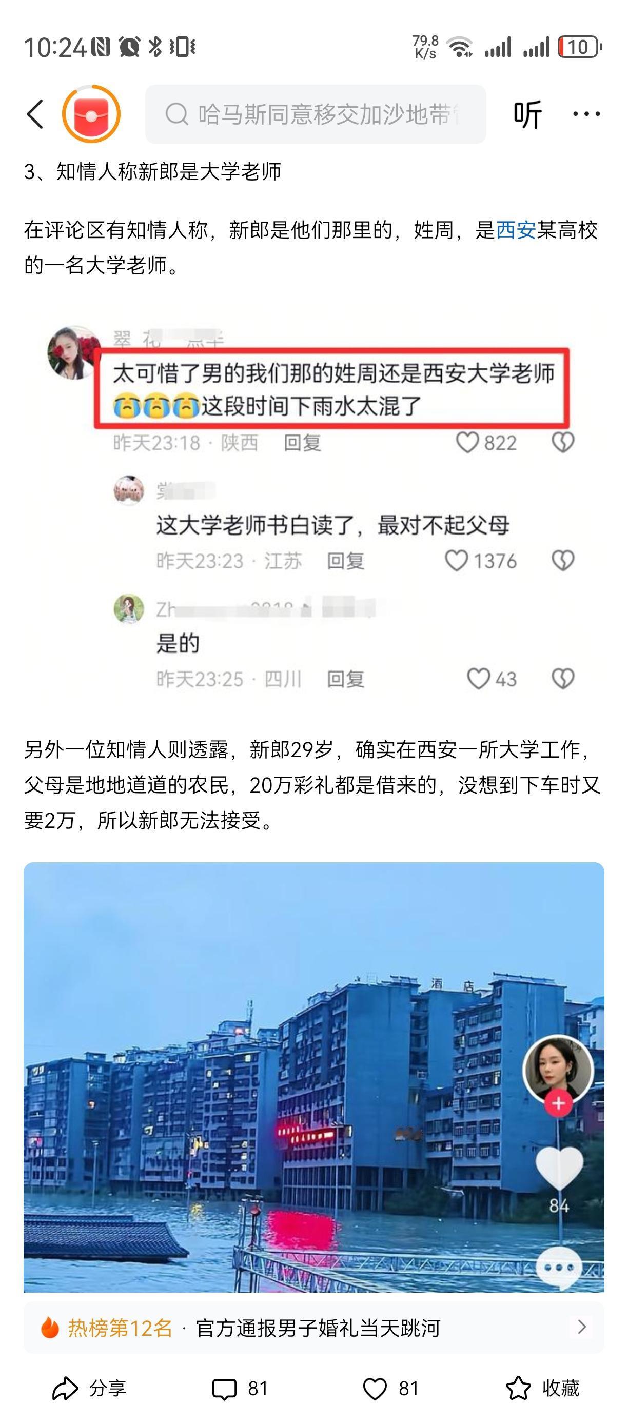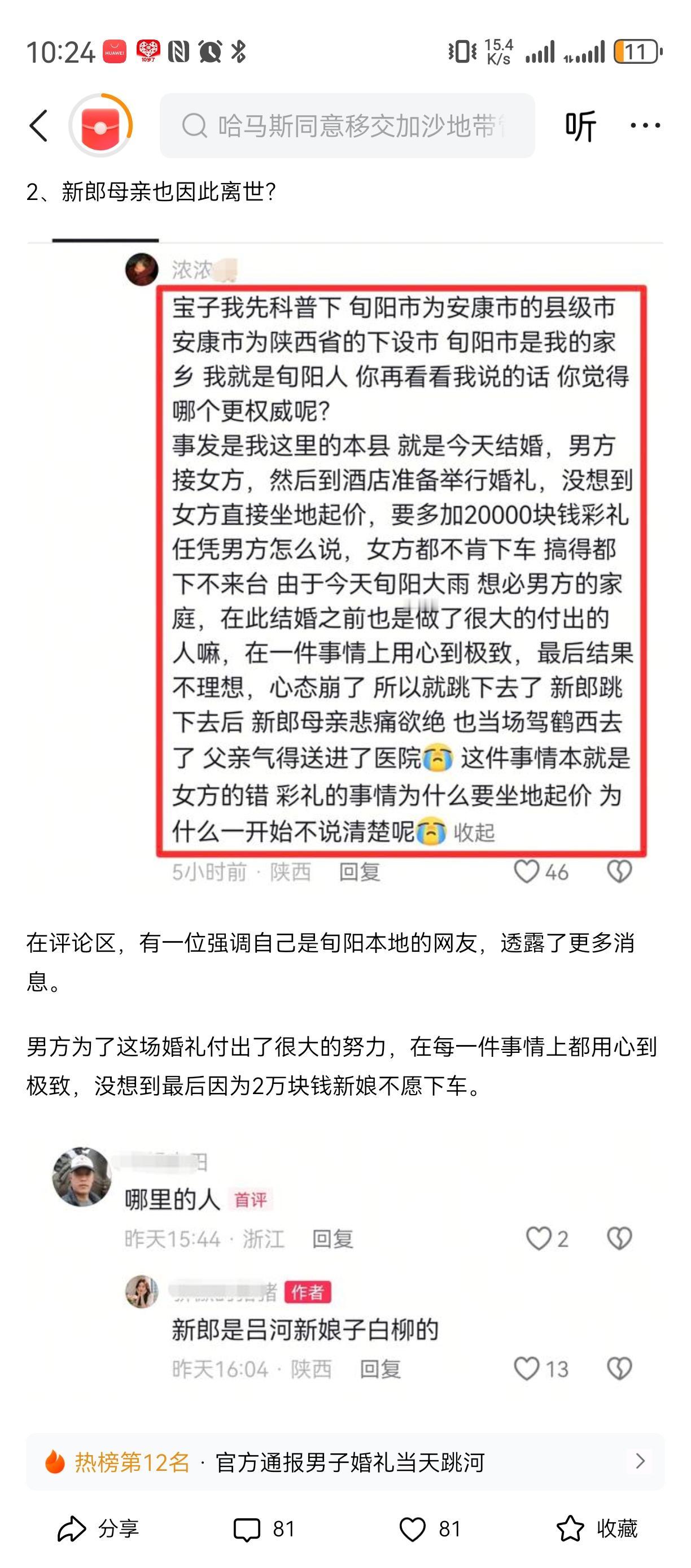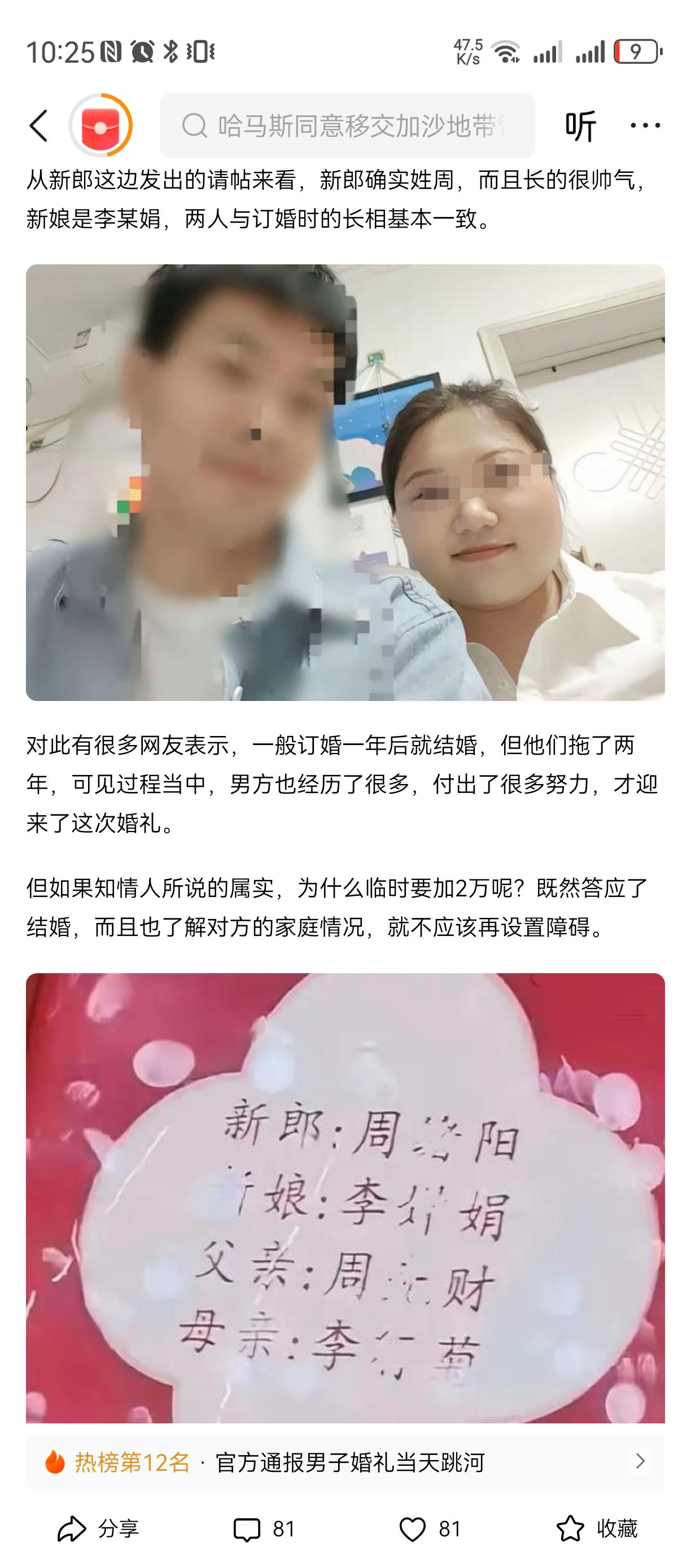 假消息! 昨日因为临时加彩礼的新郎是高知? 还是大学教师? 不可能吧, 大学里什么样的女生没见过? 彩礼过高问题 这种要彩礼的直接不要🙅 何必还搭上自己的性命 留下父母白发人送黑发人! 三万元不就是一点工资?情侣彩礼