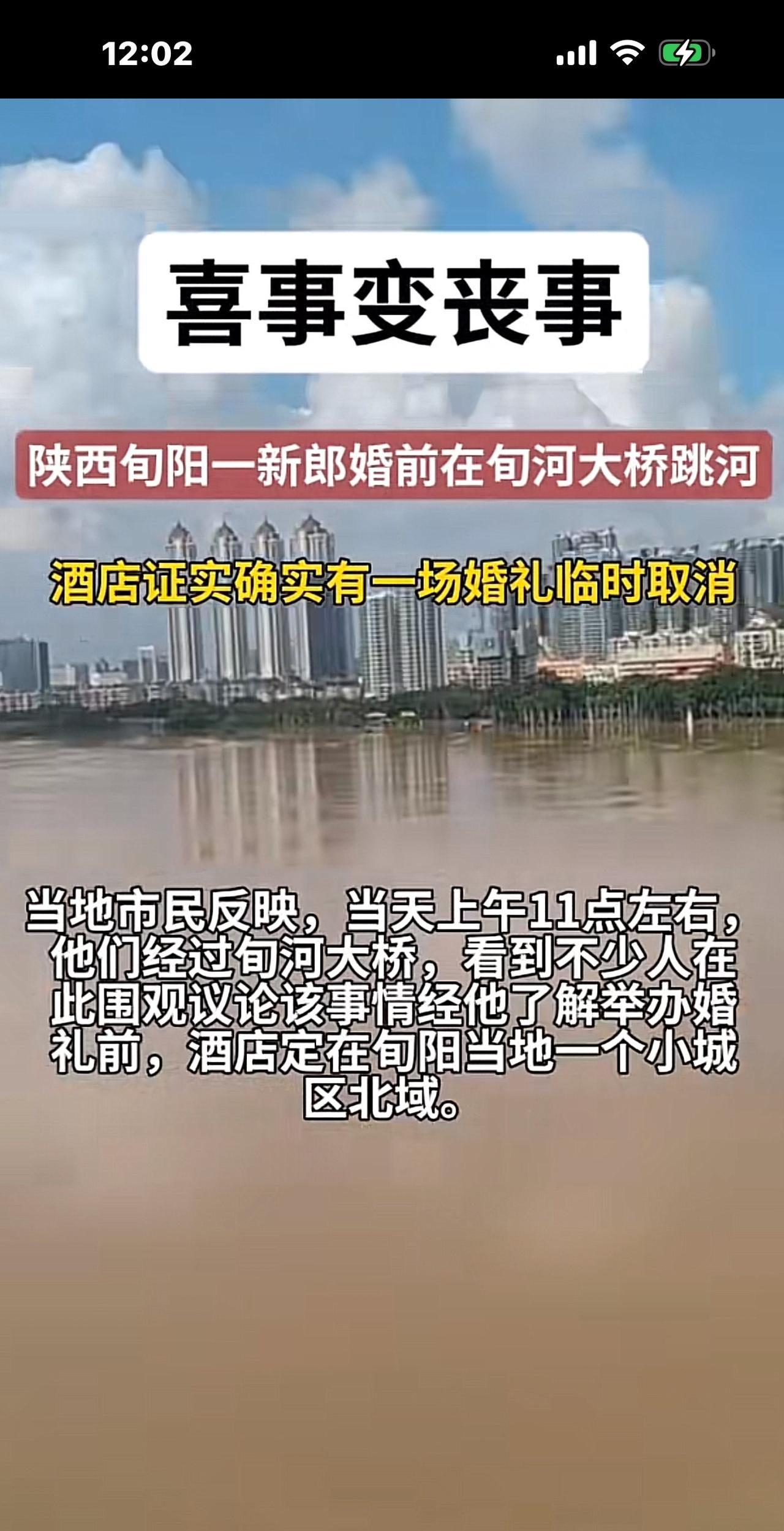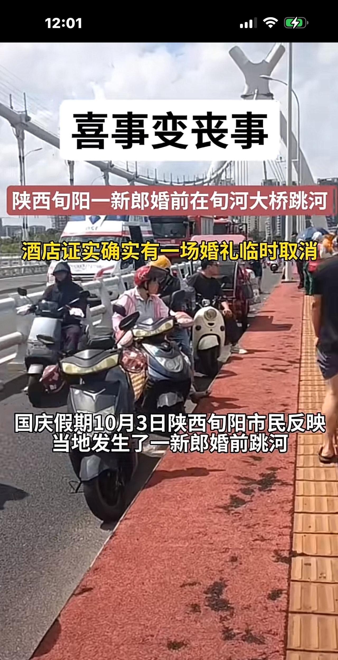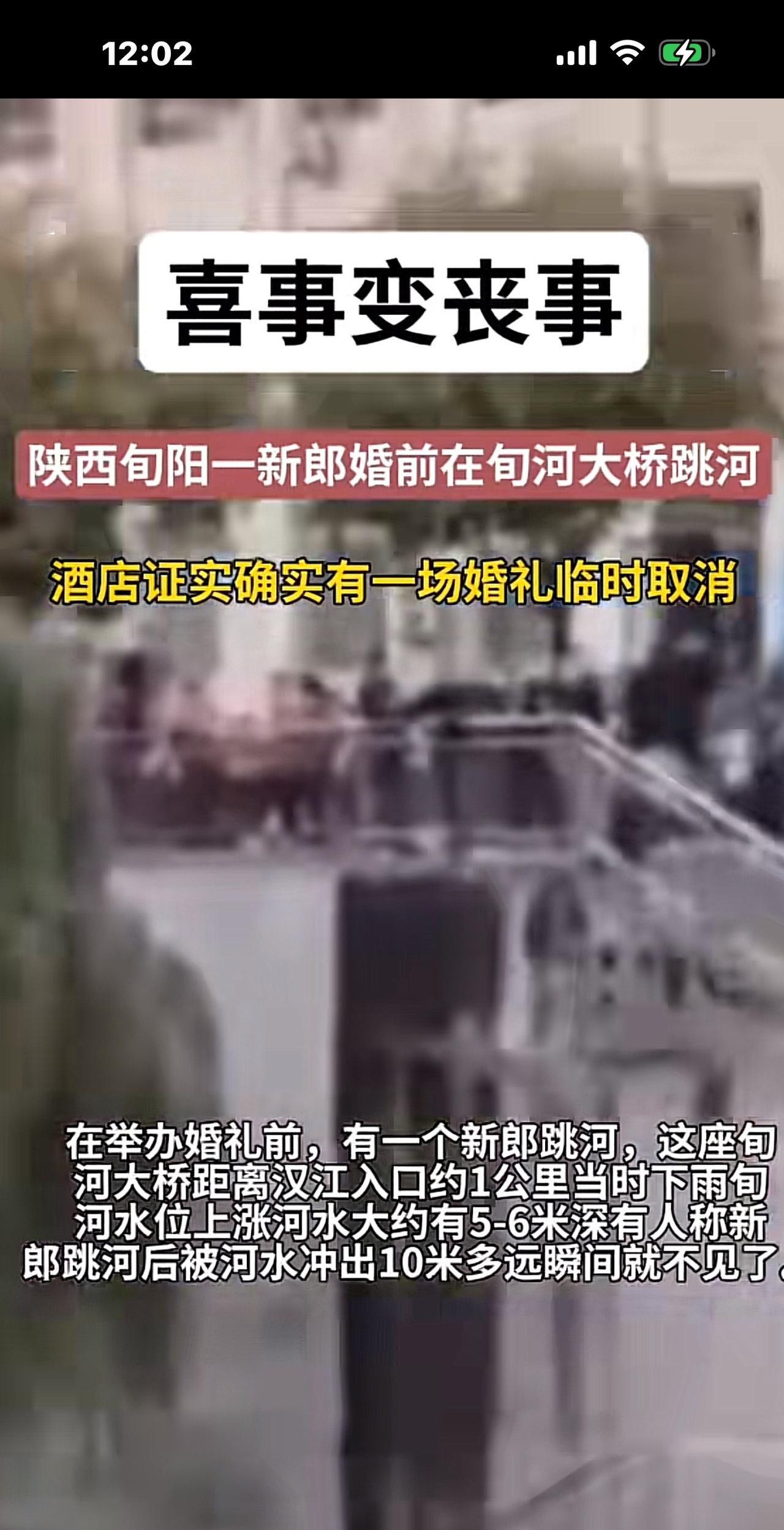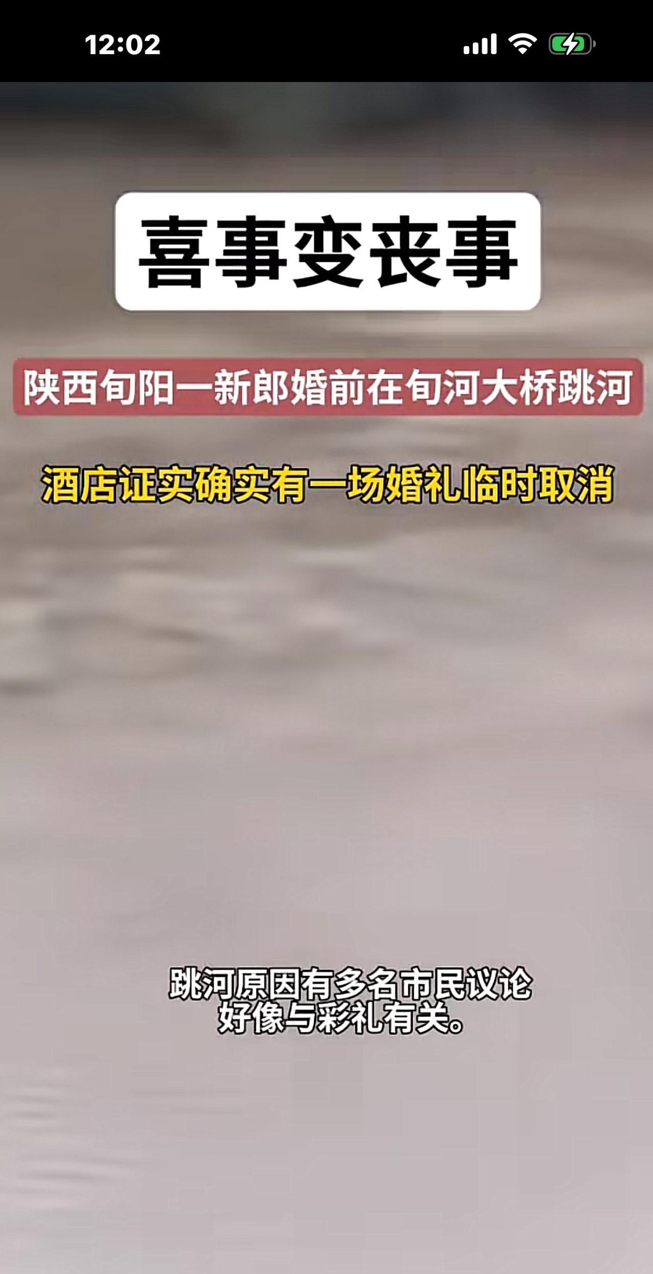陕西29岁新郎官举办婚礼时跳河,网传女方父母加要2.2万下车费,才能过门,新郎愤而从酒店跑出,从桥上一跃而下。 事发于10月3日,陕西旬阳的一座大桥。 由于连日下雨,当时河水暴涨,水流浑浊,新郎官从酒店跑了100多米后,从桥上一跃而下,先是在河水里冒了一下头,他本能地划了一下水,就被冲走10多米以后不见了,至今搜索无果。 视频里,许多人站在岸上亲眼目睹了这场事故,一场喜事变成了丧事,太悲催了。 不知道上面网传的跳河原因是否真实,但官方给出的通报是“因家庭琐事原因”,才导致了这出悲剧发生。 有人说,跳河的新郎官太意气用事了,拿不出2.2万,可以退婚,不结婚就是了,身体是父母给的,你自行了断,是对父母的大不敬、大不孝呀,你叫他们白发人送黑发人,以后要怎么活? 又有人说,新郎官太软弱了,不像个大丈夫,任人宰割,你越忍让越伤害自己,怎么能伤害自己呢?你要做一个强者,面对咄咄逼人的无理要求,一棍子给它击回去。大丈夫何患无妻,不结婚拉倒。 更多人严斥女方父母,和狮子大张口的彩礼陋习。 具体跳河原因我们不得而知。 但如果真是被彩礼所困,站在新郎官一方,很可能他家本身不富裕,东拼西凑,好不容易凑出了彩礼钱,现在对方父母又突然加要两万多的下车费,才能让新娘子过门,接回家,是对方突然变卦,不诚信,让新郎官感觉自己像猴一样被人耍了,让人笑话。 也许他比较重视传统风俗,被它所禁锢,才会跳河反抗,可是该笑话的绝不是他,而是漫天要价的彩礼,他只是一个受害者。 另外,如果他真的非常爱自己的未婚妻,又拿不出两万多块钱,未婚妻也表示自己深爱着他,那他真的很难过啊,有时候就是一根稻草的事,压在伤痕累累的骆驼背上就把它压垮了。 我们不信谣,不传谣,还是等待官方通报具体的跳河原因吧。 [祈祷][祈祷]