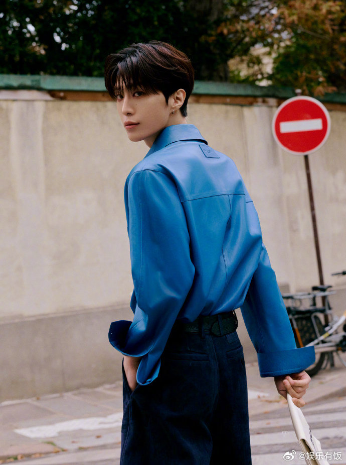 巴黎时装周的秀场看点十足!范丞丞一身蓝色皮质外套,硬朗线条尽显型格,搭配的麂皮长