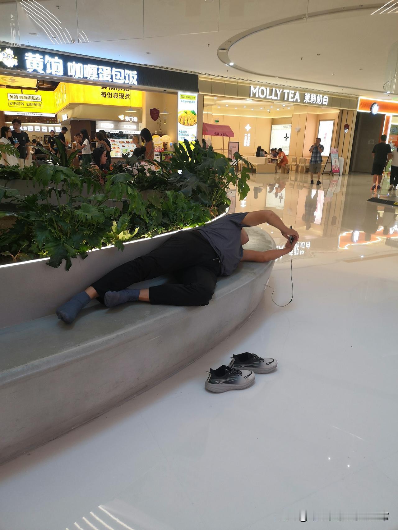 大哥,商场这里不是睡觉的! 逛商场撞见离谱一幕:大哥脱了鞋往公共休息区一躺,手机玩得飞起,把商场当自家卧室了!旁边餐饮区香味飘着,他愣是在绿植旁“岁月静好”,路过的人都得绕着走。 有人说打工人太累,商场躺会儿咋了;有人骂公共场合没边界感,膈应人。这场景就像一面镜子,照出了“舒适自由”和“公共秩序”的碰撞。你觉得商场躺平,是情有可原还是该被怼?