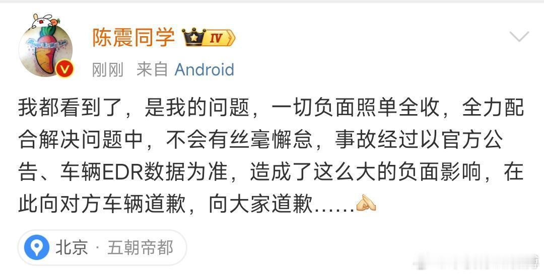 这是事故发生到现在,陈震首次正面回应,态度还是蛮诚恳的。作为公众人物,以后还是注意点吧。