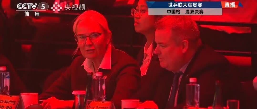 混双比赛时, 镜头转向了看台, 看见了国际乒联主席佩特拉·索林, 她旁边那个人不知是谁。 真是太幸运了, 她亲临现场观看孙颖莎/王楚钦的混双比赛。