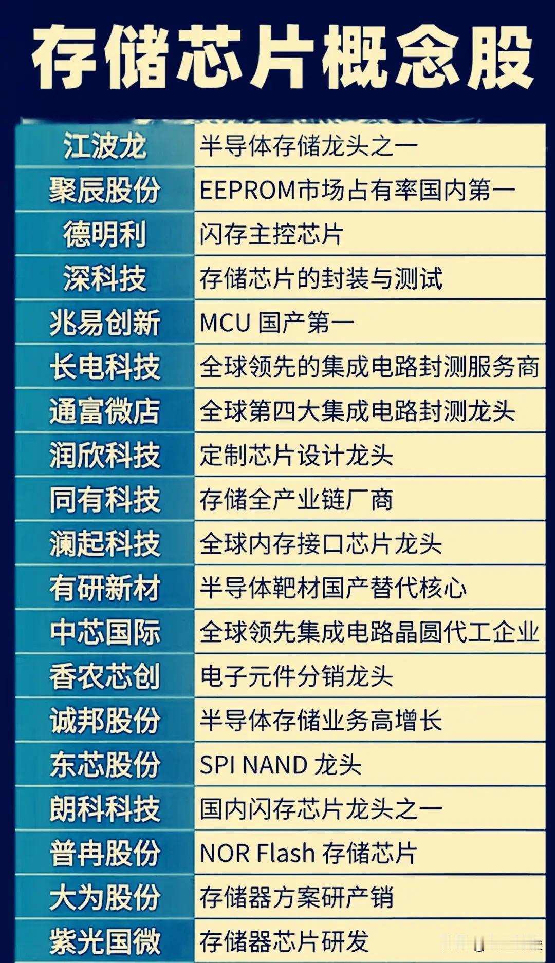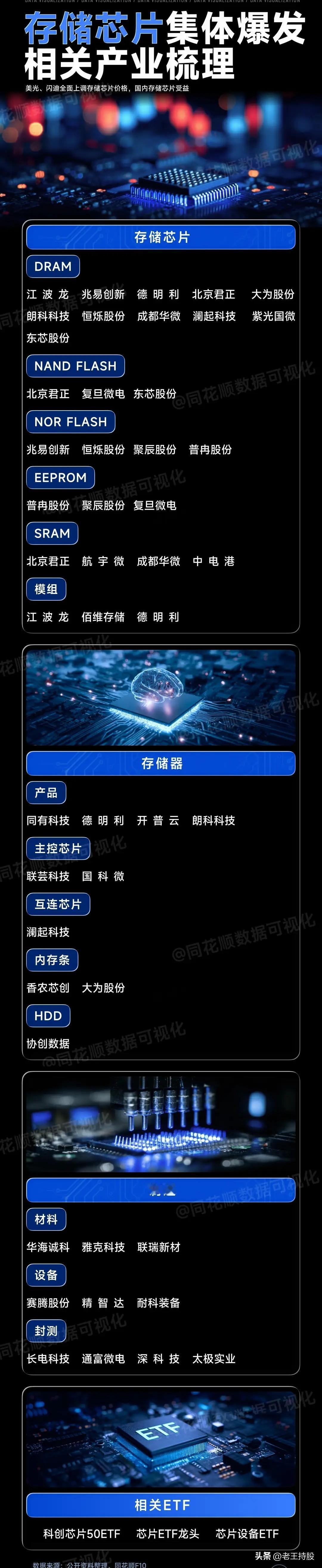 A股市场10月主线及相关热门板块,核心内容可总结如下: 一、10月A股主线梳理(整体市场热点方向) 聚焦10月A股市场的核心投资主线,覆盖多个高关注度板块,具体包括: - 固态电池/储能(虽未列具体个股,但属重点板块之一) - 证券:如华泰证券、国盛金控、湘财股份、东方证券、中信证券、东方财富等 - 人形机器人(未列具体个股) - 半导体:包含中芯国际、向日葵、立昂微、德科立、香农芯创、澜起科技、通富微电、长电科技、万润科技、中微公司、拓荆科技等 - AI应用:如科大讯飞、利欧股份、浪潮信息、歌尔股份、贵广网络、漫步者等 - 有色金属:如铜陵有色、洛阳钼业、华友钴业、紫金矿业、博迁新材、湘潭电化、兴业银锡、盛达资源、北方稀土、招金黄金、山金国际、湖南白银等 二、存储芯片相关专项内容(细分领域聚焦) 1. 存储芯片概念股:介绍了江波龙(半导体存储龙头之一)、聚辰股份(EEPROM市场占有率国内第一)、德明利(闪存主控芯片)、深科技(存储芯片封装与测试)、兆易创新(MCU国产第一)、长电科技(全球领先集成电路封测服务商)等公司及其业务优势,覆盖存储芯片产业链多个环节。 2. 存储芯片产业全貌:梳理了存储芯片类型(如DRAM、NAND FLASH、NOR FLASH、EEPROM、SRAM)及相关企业(如江波龙、兆易创新、北京君正等),同时涉及存储器/内存条(江波龙、佰维存储等)、主控芯片(联芸科技、国科微)、互连芯片(澜起科技)、材料(华海诚科等)、设备(赛腾股份等)、封测(长电科技等)及制造环节,并提及相关ETF(如科创芯片50ETF)。 3. 行业动态:美光、闪迪全面上调存储芯片价格,带动国内存储芯片企业受益。 三、半导体行业资金动向(基金持仓视角) “基金抱团半导体公司30强”展示了30家被基金重点持有的半导体企业,涵盖数字芯片设计(如寒武纪、中芯国际、兆易创新、豪威集团)、晶圆代工(中芯国际、华虹公司)、半导体设备(中微公司、拓荆科技、北方华创)、材料(沪硅产业、鼎龙股份)、模拟芯片设计(圣邦股份、卓胜微)等细分领域,具体数据包括基金持股市值(如寒武纪1186.4亿)、持股基金家数(如寒武纪1308家)及细分领域标签。 四、储能板块动态(政策驱动热点) 受国内大力发展风光发电及海外强劲需求带动,储能板块持续走强(如9月30日派能科技涨停)。该板块按业务领域分为五类企业: - PCS&大储集成(如阳光电源、禾望电气、宁德时代、比亚迪等18家) - 电池(如宁德时代、亿纬锂能、欣旺达等7家) - 算力电力协同(如中恒电气、南网科技、国电南瑞等8家) - 储能EPC(如中国能建、中国电建、海博思创等8家) - 就近消纳方向(如国电南瑞、国能日新、泽宇智能等6家) 总结 整体来看,10月A股市场主线集中在科技(半导体、AI应用、存储芯片)、新能源(固态电池/储能)及金融(证券)领域,其中半导体(尤其是存储芯片、先进制程相关企业)和储能板块因政策或市场需求驱动成为资金关注重点,相关细分领域的龙头公司及基金持仓动向为投资者提供了明确的方向参考。