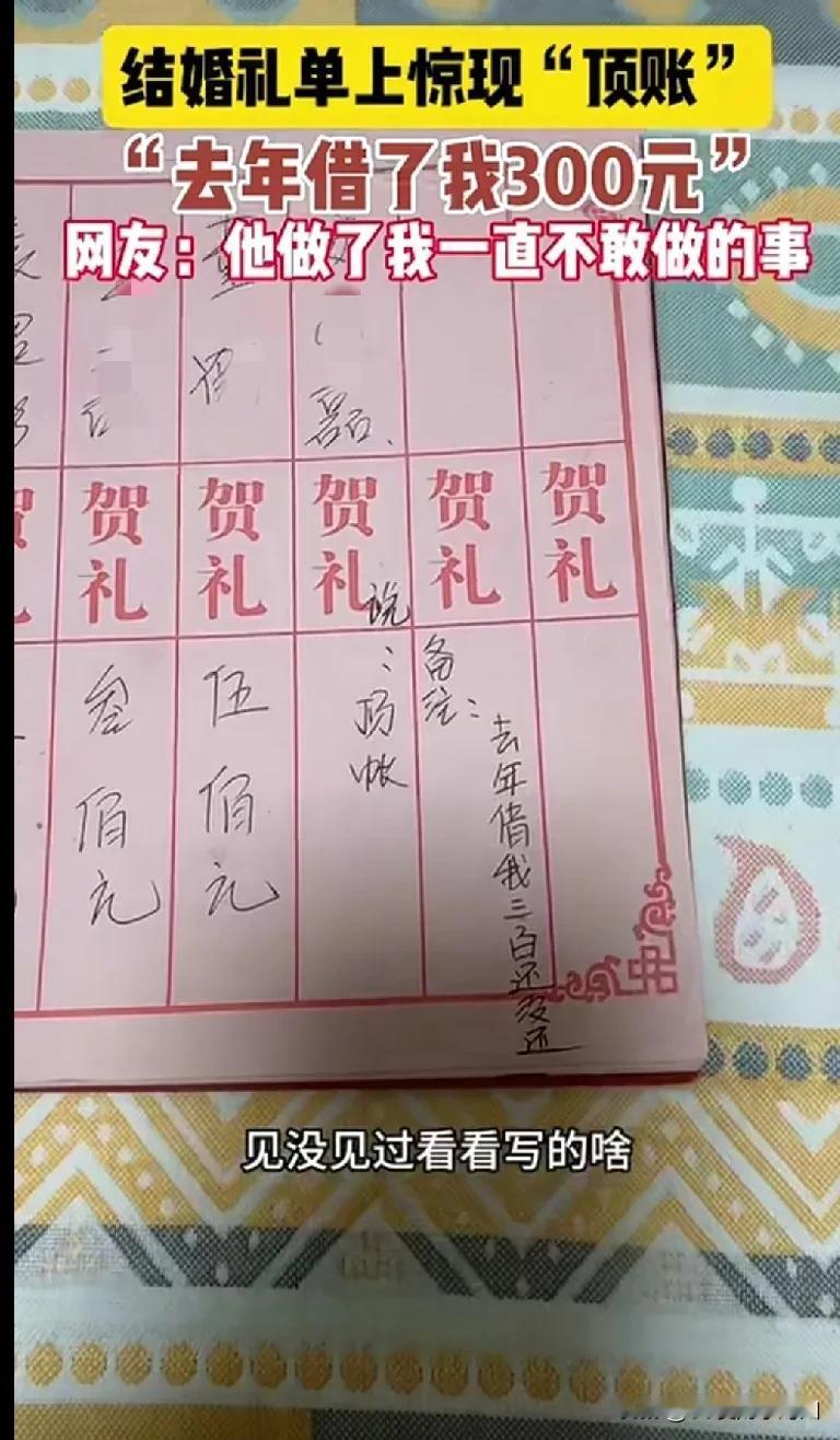 “最特别的礼金!”新人结婚当天,忙完后主人去查看客人上礼的礼单,竟然在礼单上看到了“顶账”,备注写着:去年借我300还没还!所以今天就不给钱了,直接抵了,这下就两清了! 主人在看到这一幕气的不行,质问怎么会有这样的人,哪有人上礼钱还能用顶账的啊,于是气愤的发到网上抱怨! 对此有网友说:欠钱跟礼账是二码事,这么做的人也是一个无底线的人,欠你钱你可以要,但不能在礼账上写这个羞 辱人! 可如果能要得到,他还用这样吗?欠人家300元不还,还好意思说人家? 也有网友说:没有错!你的钱是钱别人的就不是吗?我朋友借我5500两年了不给,他结婚时候也是这样顶账的,关键是跟博主一样不知足,给我打电话质问我半天。你说气人不气人。 还有网友说:干了我一直想干却不敢干的事,牛! 说实在,欠人家300元不是3万,一年了都没还,是还不起吗?应该不至于吧,都有钱结婚了,这明摆着就是不想还,自己还不守信的,为啥别人还要给你面子?你是怎么好意思给人家下请帖的?你欠人家钱不还,人家不给你随礼都正常,然后人家还厚道的给你随了三百,虽然是抵账,至少这个钱你不用还了。要不人家不给你随礼,还问你要回人家的三百你也没的说不是吗? 这是得了便宜还卖乖,怎么好意思去责怪别人呢?真是人不要 脸,天下无敌! 对此你怎么看?你觉得男子做的有问题吗?