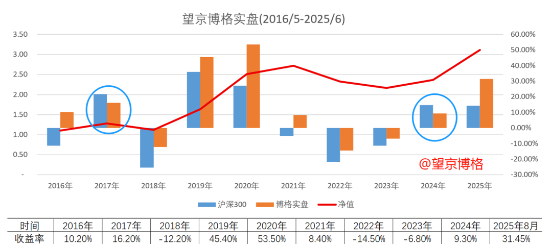 博格只有在2017年与2024年跑输沪深300,剩余八年时间均跑赢沪深300指数,十年累计收益更是大幅跑赢沪深300指数。