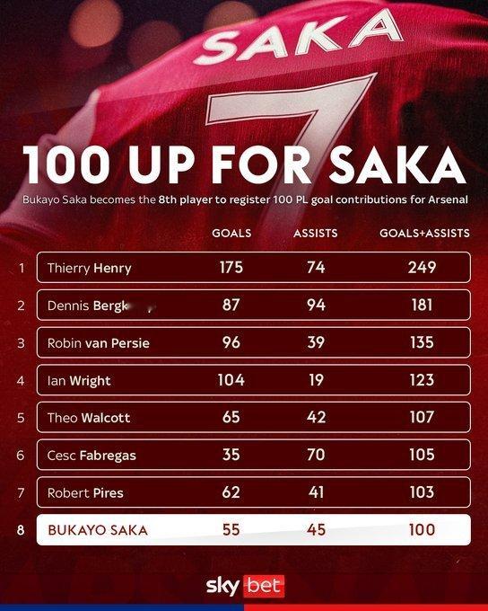 萨卡英超进球+助攻数排到阿森纳队史第8名[看涨]