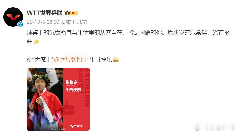 WTT祝张怡宁生日快乐“大魔王” 的传奇永不褪色,今天是的生日,WTT世界乒联发博送上祝福。