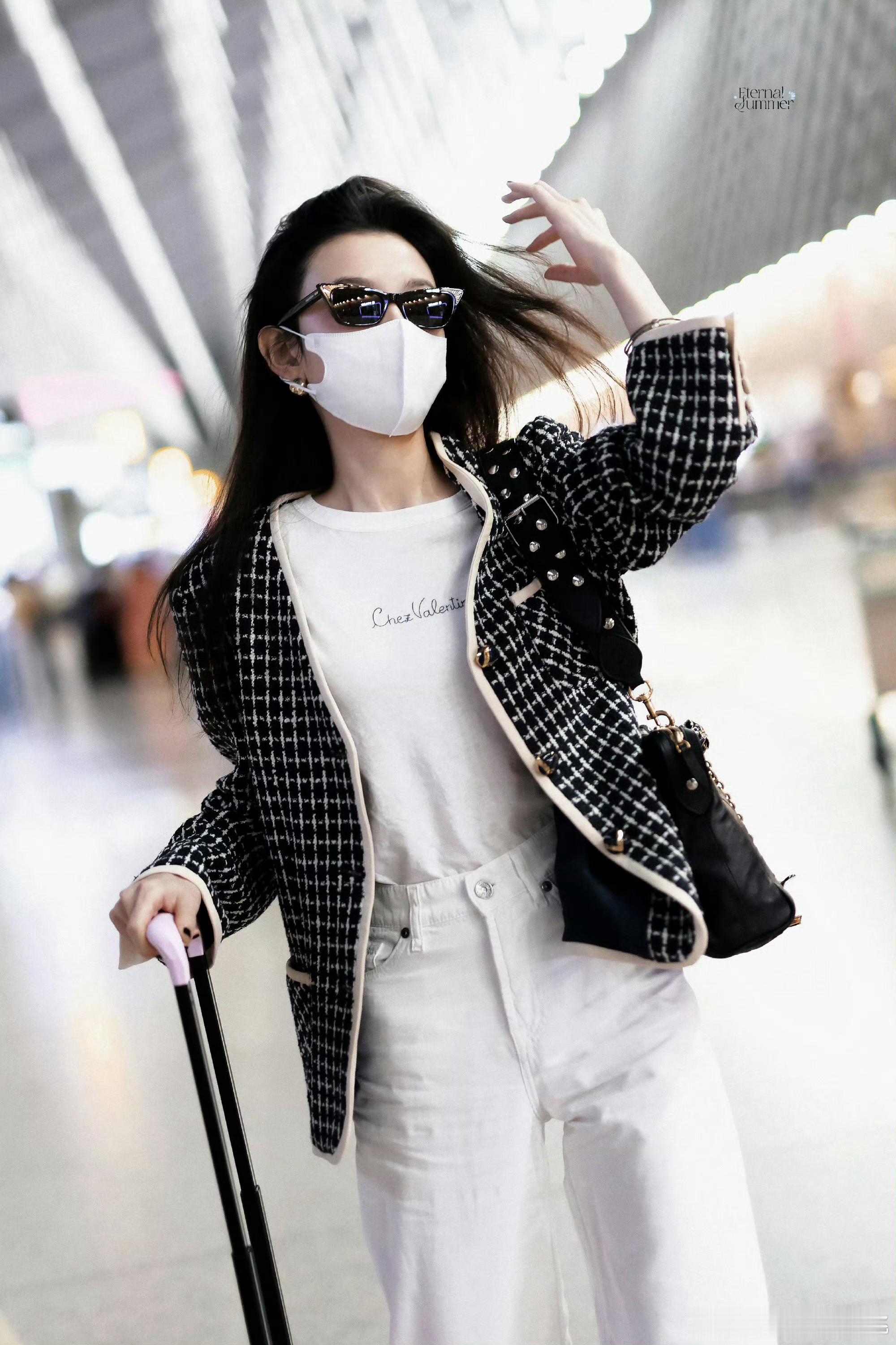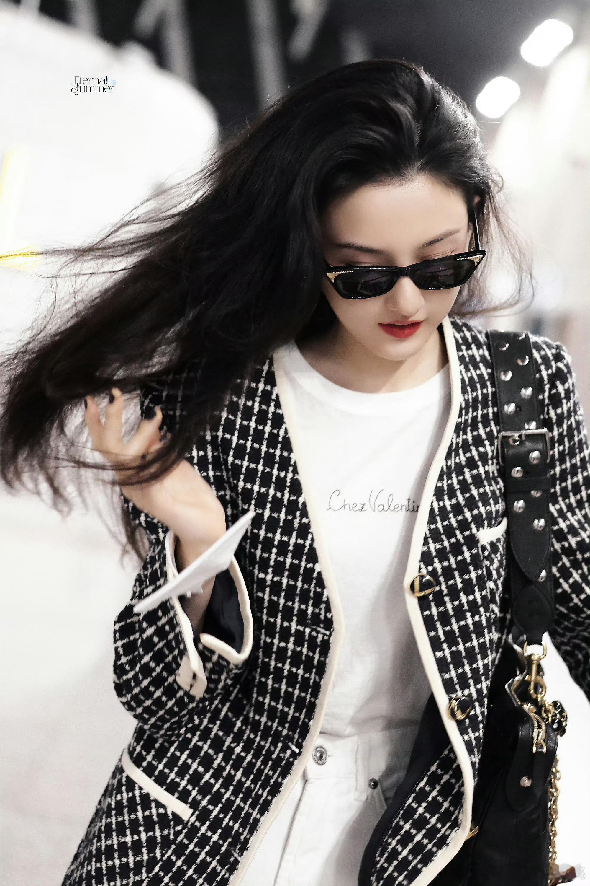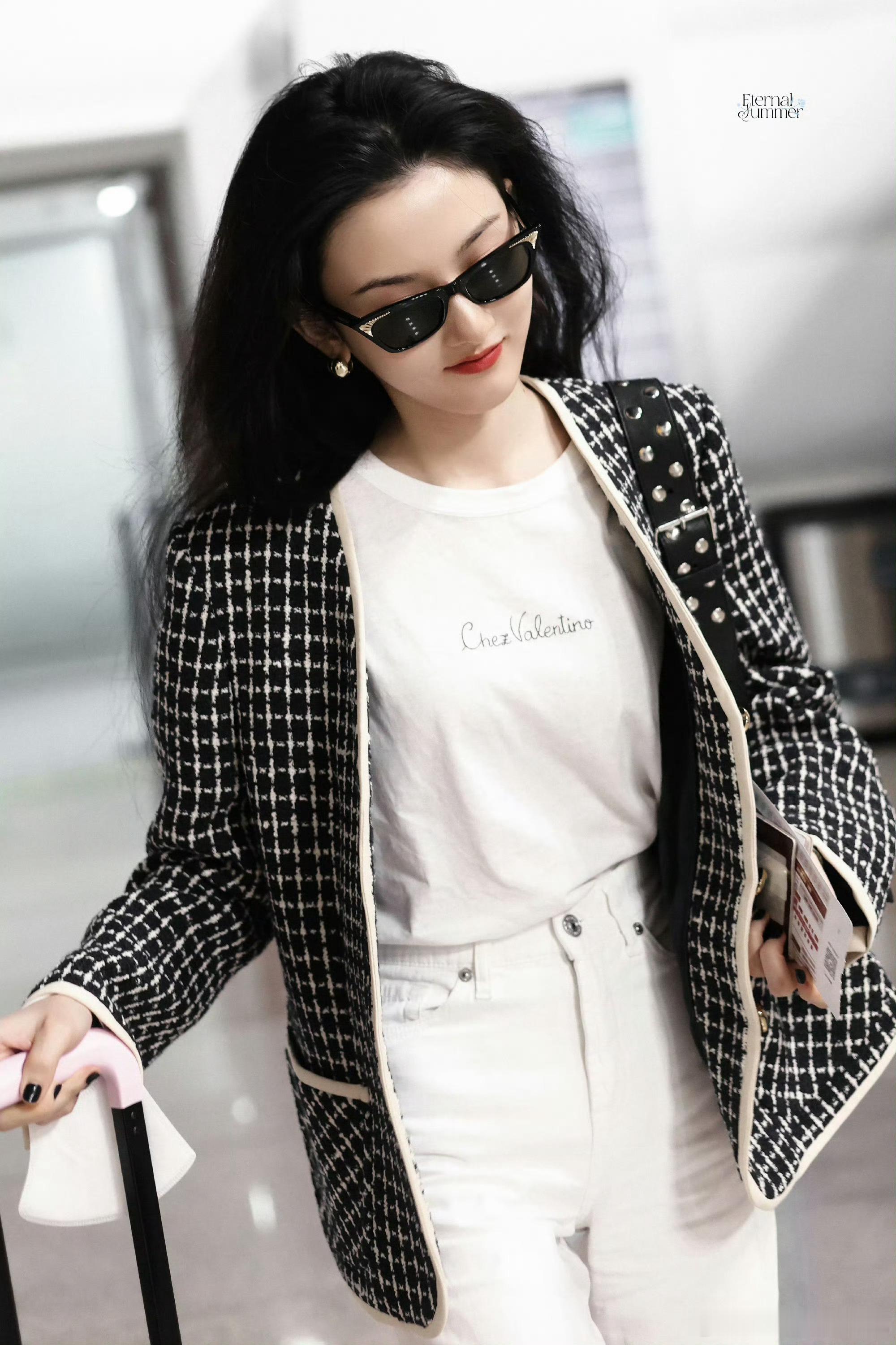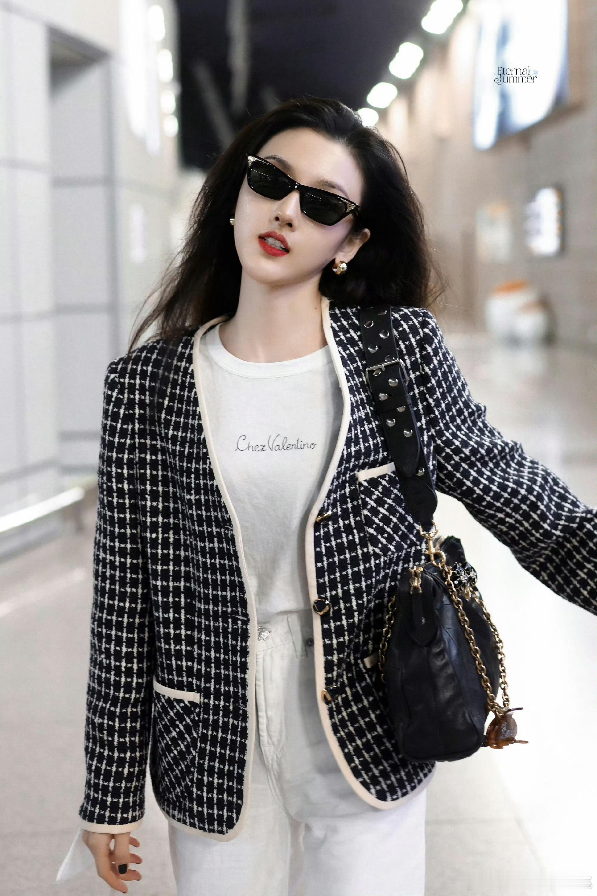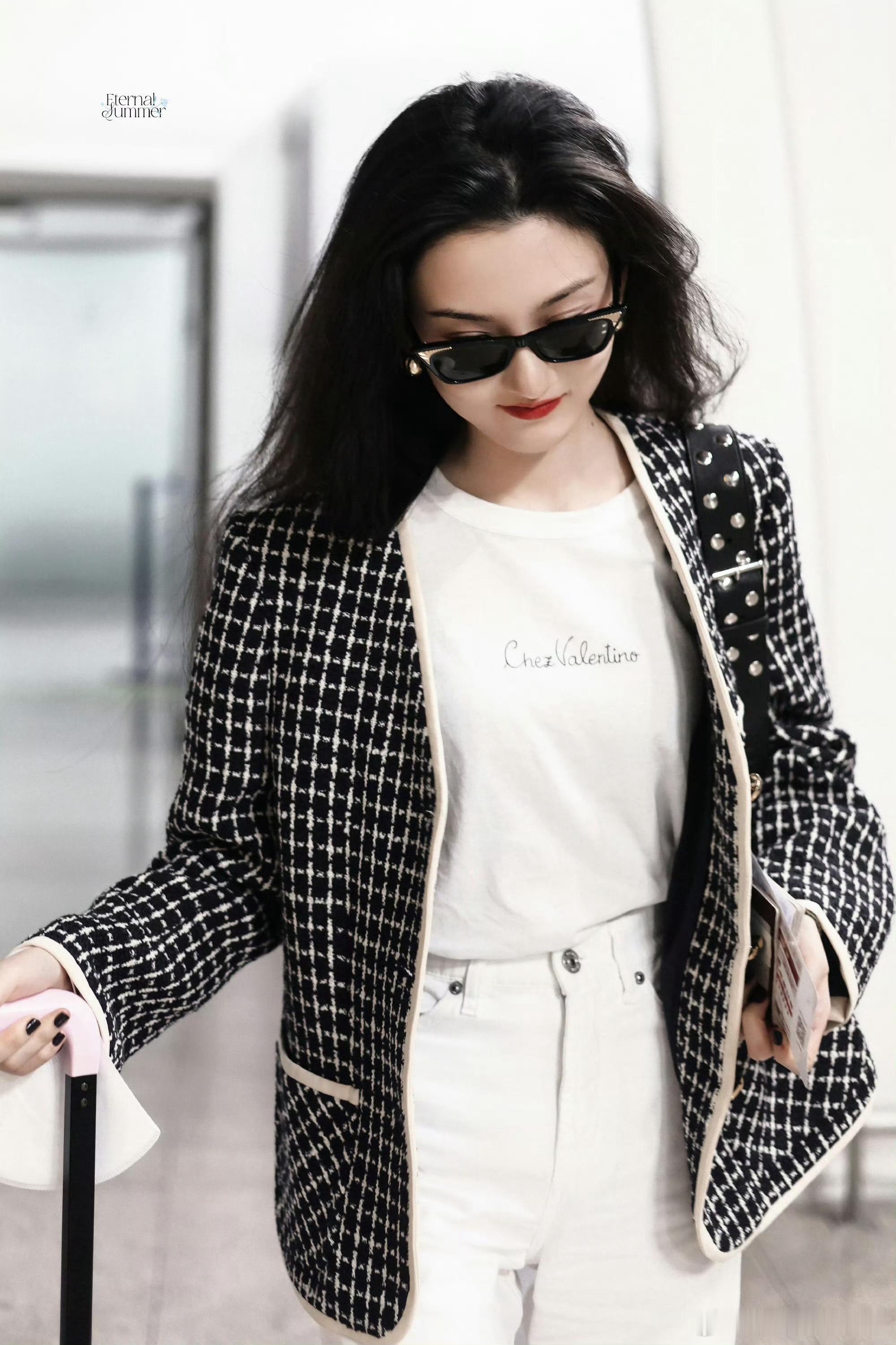 华伦天奴美妆品牌代言人宋祖儿身穿Valentino 2025秋冬系列千格鸟外套,黑超配Panthea手袋机场出发,即将出席品牌2026春夏系列大秀💋 港风美人来啦!!!