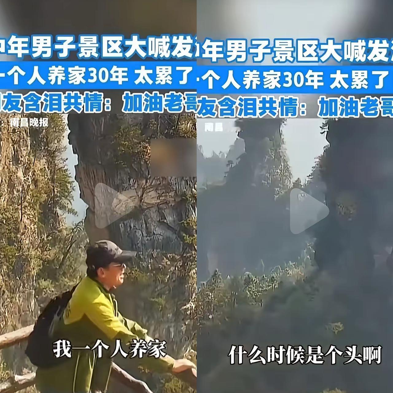 “一个人养家30年,太累了,什么时候是个头啊...” 听景区里一位大哥嘶吼着喊出这句话,突然就破防了。 这哪是发泄啊,分明是三十年积压的疲惫终于憋不住了。谁听了不心里一酸? 三十年什么概念?孩子从出生到成家,父母从壮年到白发。这老哥用不算宽厚的肩膀,硬是扛起了一个家的天。 累吗?当然累。但责任在肩上,再累也得往前走。 想起我二叔。开出租车二十多年,每天坐车里十几个小时,腰早就坏了。有回喝多了说:“真想歇一天,可孩子学费、房贷、老人药费,哪样允许你停下?”第二天五点,他又出车了。 这就是中国中年男人的缩影! 正是这些沉默的坚持,撑起了千万个普通家庭的屋檐。 老哥,加油!我们都懂。 生活不易,但你不是一个人在战斗。