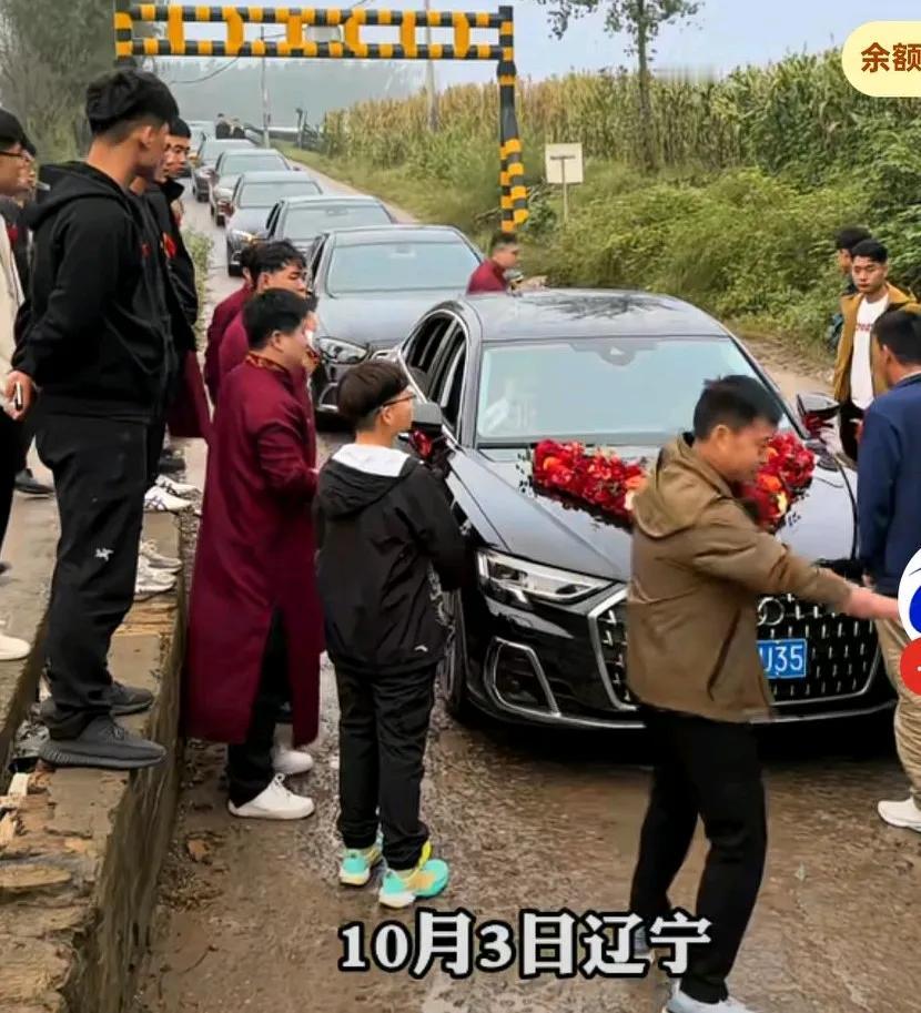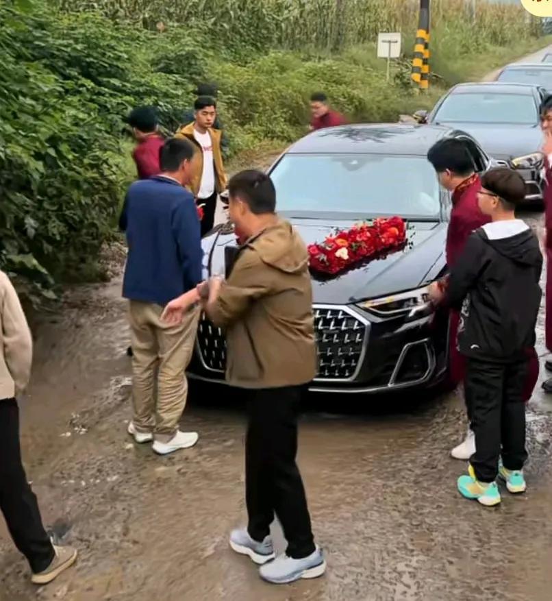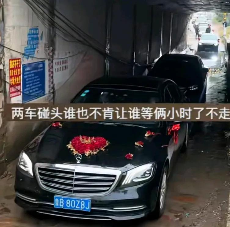 新车碰头后,为了不走回头路。两方任是谁也不让, 等了两个多小时, 网友说,这题到底怎么解, 双方看路的时候没有想到, 在这条狭窄的小路上会碰到别的迎亲队伍吧, 是呀,人家结婚不走回头路,且看这路只能一辆车通过, 不是双车道, 网友出主意, 新郎下来背着新娘回家吧, 如果双方都靠右行驶, 会不会错过去呢, 看道路很窄,不好错车, 这样僵着吉时都会过了, 有的说新娘互换一下车, 应该就可以了。