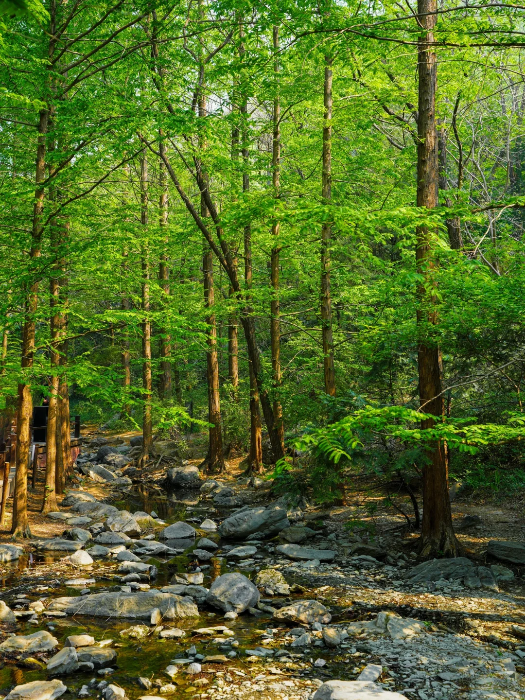 溪水潺潺作响,绿树参天荫翳,恍如人间仙境