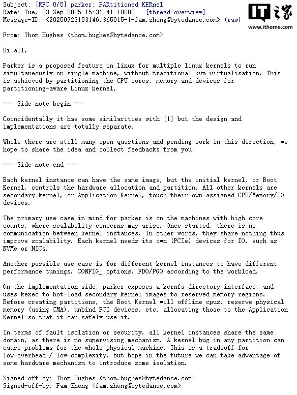 [字节跳动工程师提出Linux多内核方案Parker,实现无虚拟化多系统并行]字节跳动工程师提出Linux多内核方案Parker,实现无虚拟化多系统并行。该方案通过划分硬件资源,使多个Linux内核能在单台服务器上独立运行,满足多样化工作负载需求。目前提案已提交至Linux内核邮件列表,引发社区讨论。#Li……