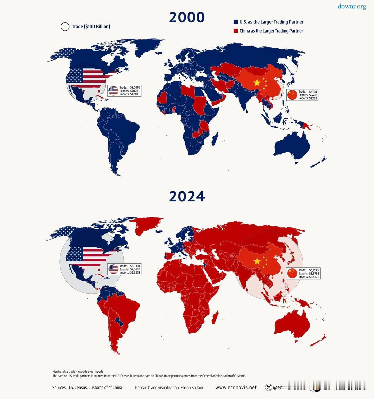 世界多数国家对中国的贸易超过对美国贸易 ! 上图蓝色代表与美国贸易比对中国贸易更多的国家,红色代表与中国贸易比对美国贸易更多的国家。 2000年,世界上绝大多数国家对美国的贸易都超过对中国的贸易额。 到了2024年,除了欧洲 的英国法国挪威,以及北美的墨西哥,加拿大,以及中美洲国家外,世界上绝大多数国家与中国的贸易额都超过了与美国的贸易,包括多数南美洲国家所有非洲国家,多数欧洲国家,几乎全部亚洲国家。 事实上,中国已经是世界上130多个国家的最大贸易伙伴。 此消彼长,显示了中国经济对世界的影响力,也显示了中国与世界的相互依赖。