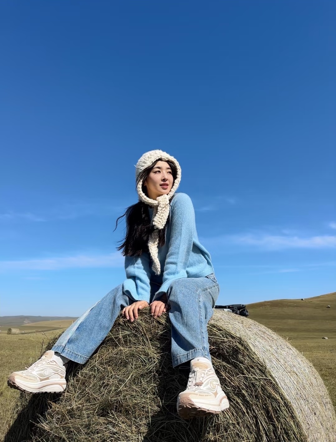 张含韵的旅游照,真好看啊~她还提醒大家别独自前往,一个人上不去,把草卷踩散是要赔钱的。。。 ​​​