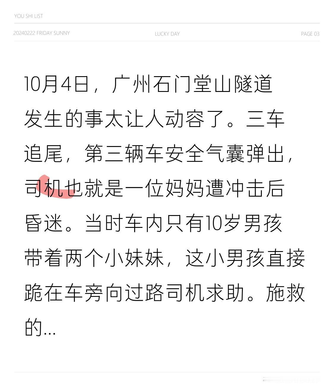 10月4日,广州石门堂山隧道发生的事太让人动容了。三车追尾,第三辆车安全气囊弹出,司机也就是一位妈妈遭冲击后昏迷。当时车内只有10岁男孩带着两个小妹妹,这小男孩直接跪在车旁向过路司机求助。 施救的刘女士说,小男孩跪在地上一直拜,哭得撕心裂肺求大家救妈妈。她顾不上多想就下车,先报了警,经警方同意把男孩妈妈扶上车送去医院,还把三个孩子都带上了车。后来孩子妈妈报平安还专门联系刘女士致谢。这小男孩危急时刻勇敢救母,刘女士热心相助,满满的正能量啊!