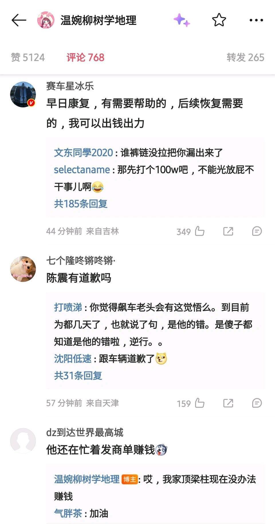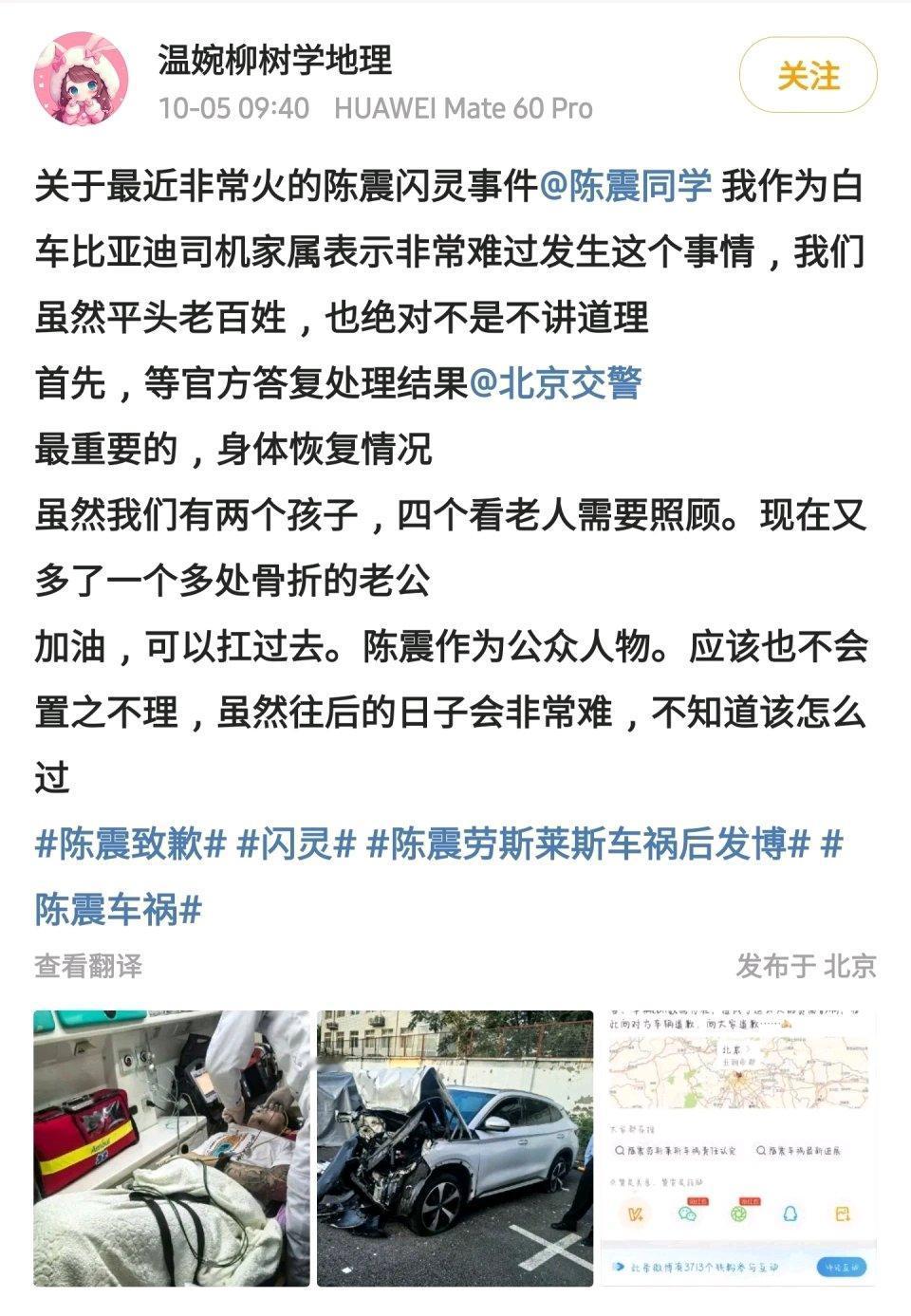 10月5日,网红车评人陈震驾驶劳斯莱斯闪灵逆行撞车一事闹得沸沸扬扬。官方初步通报陈震负全责,但他态度“暧昧”,要等事故调查结果。网友们各种猜测,关注点大多在陈震身上。 这时,一位自称白车司机家属的网友发文。她称自己和老公是“平头百姓”,会等官方答复,目前首要的是让骨折的老公恢复身体。她家有俩孩子、四个老人要照顾,以后日子会很难。陈震随后转发家属博文道歉,表示会做好后续工作和补偿。希望这起事故能妥善解决,让家属早日回归正常生活。