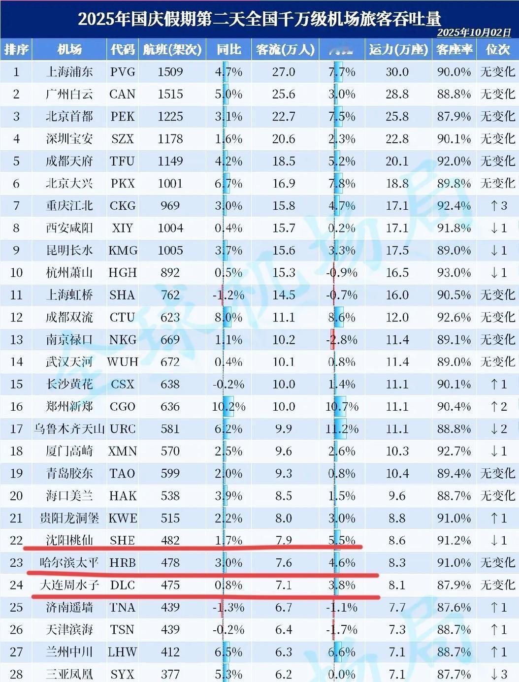 国庆假期第二天,全国机场客流数据出炉了。热门城市排名显示,乌鲁木齐、福州、郑州、成都、上海和北京位列前六,这些地方的吞吐量同比增速都超过7%,出行热度相当高。 东北地区的几个城市在假期旅游方面依然很火。沈阳和长春的增速达到5.5%,哈尔滨也有4.6%,大连同比增长3.8%,整体表现都不错。从数据今年国庆期间东北城市之间的竞争很激烈,不少游客选择去东北玩。目前沈阳和长春的增速领先,但哈尔滨作为传统冰雪旅游目的地,也可能在后续几天反超。 根据往年的规律,假期中段的客流量会保持稳定甚至小幅上升。如果按照这个趋势,沈阳因为交通便利和旅游资源丰富,有可能成为东北地区的客流冠军。不过具体结果还要看后面几天的数据更新。 素材来自网络,侵权联系删除