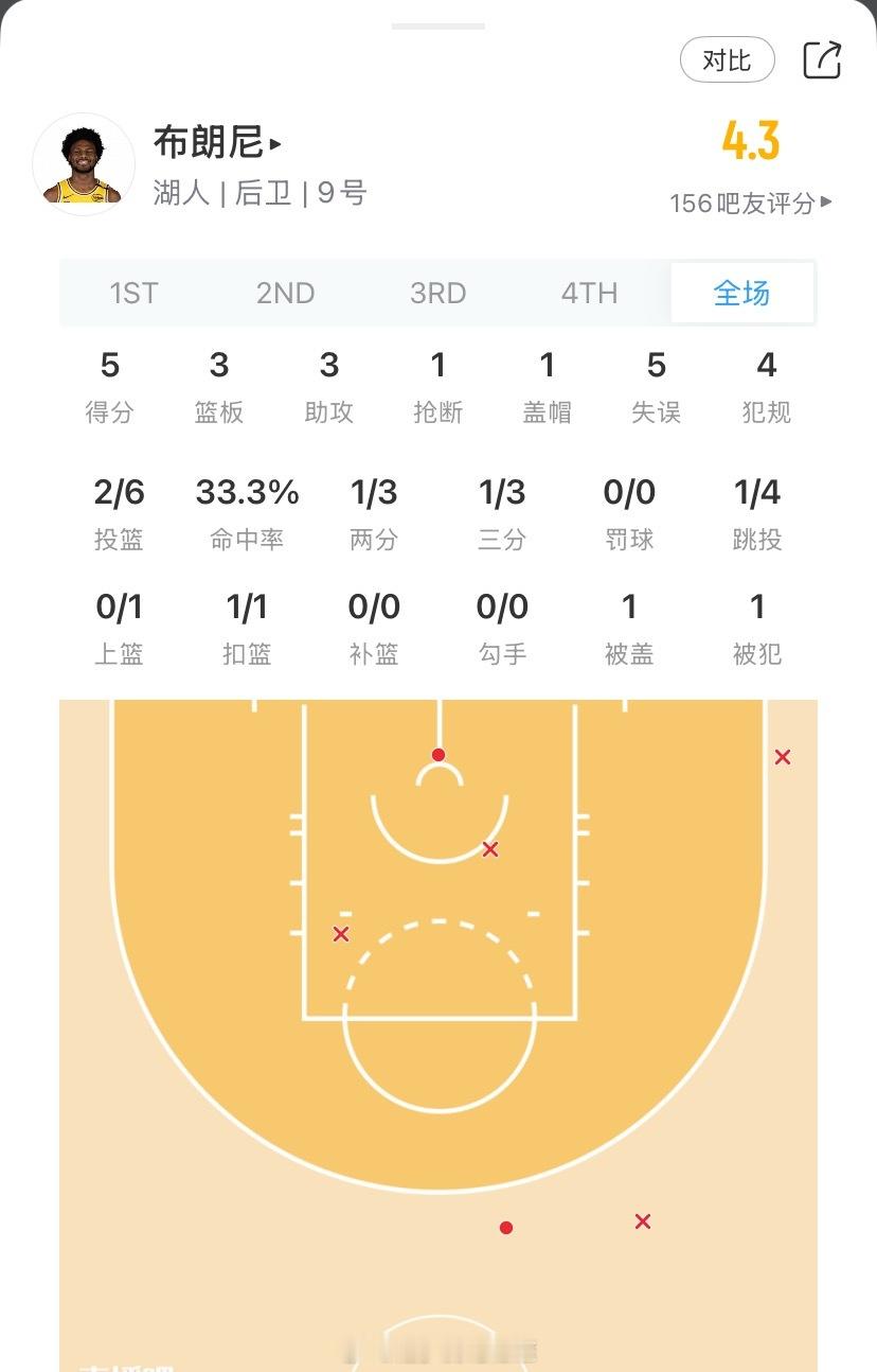 超常发挥,布朗尼全场6中2,得到5分5失误[酷]
