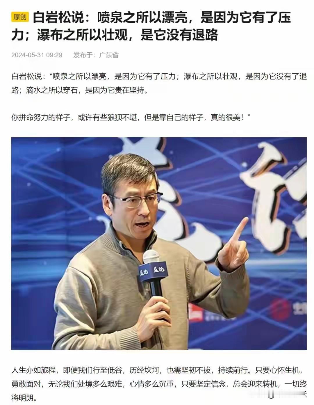 上午刷微博,刷到“@江苏新闻”一则内容。 徐州队惜败,结束今年“苏超”之旅。赛后江苏台解说员又出“满分小作文”:瀑布壮观,因无退路;滴水穿石,贵在坚持。只有坚持别人难坚持之事,才能拥有别人难拥有之物。世间没有顺理成章,不过是凡人汗水浇灌后的水到渠成。愿你我关关难过关关过,前路漫漫亦灿灿。 看到“满分小作文”,我顿生警惕,发现所谓苏超“满分小作文”是抄袭的。 一年前,白岩松说过:“喷泉漂亮,因有压力;瀑布壮观,因无退路;滴水穿石,贵在坚持。你拼命努力虽狼狈,靠自己的样子真美!”白岩松并非原作者。 继续查证,2023年自媒体曾引用与人民日报相同的话,再往前,2018年微博就有同样的“满分作文”。这“满分小作文”不过是前人话语的反复挪用。解说员看似文采好,实则“拾人牙慧”。信息爆炸时代,原创更珍贵。解说应展现思考见解,抄袭博眼球不可取。这提醒我们,发声要坚守原创底线,真诚独立表达,才能传递价值,赢得尊重。