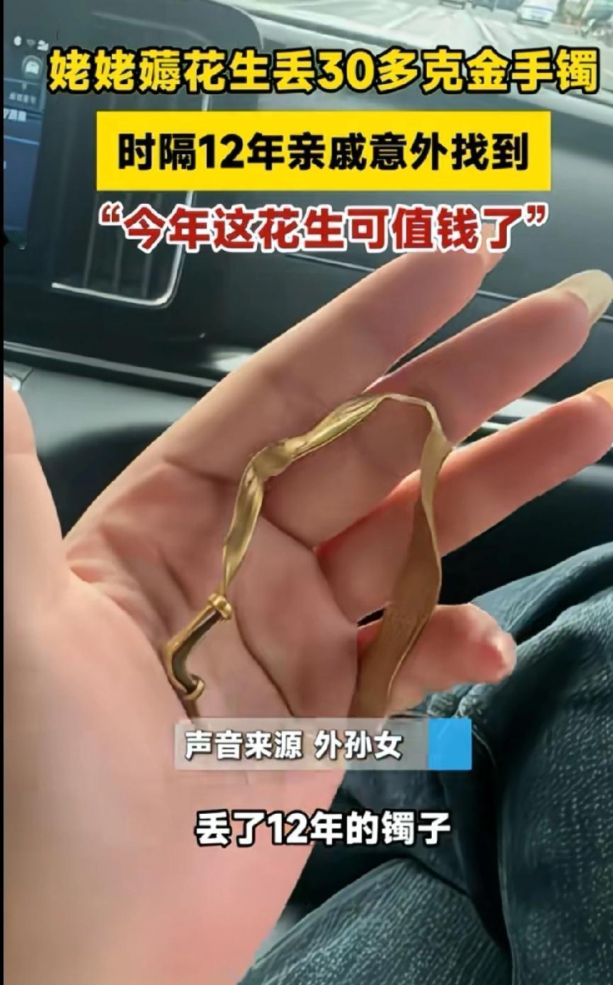 12年前丢的30克金镯子今年找到了 意外之喜了 一女子说大约2013年 的时候姥姥给她家帮忙收花生 不小心把金镯子丢花生地里了 当时怎么找都找不到 后来过了几年,这块地她们家不种了 就给她们家的一个亲戚种 没想到今年亲戚在收花生的时候 发现了这个镯子 并且还给了她们 30克值不少钱了[呲牙] 这亲戚可以呀人品杠杠滴 值得点赞[赞]