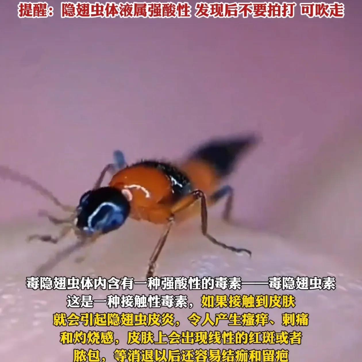 河南小女孩被虫子灼伤,20天后脖子上仍有伤疤! 这是什么虫子这么厉害? 近日,河南郑州一名4岁女孩在院子里玩耍时,发现脖子上有小虫在爬。她用手拍打脖子上的虫子,没想到拍打之后脖子越发发红发痒,医生诊断为隐翅虫毒素灼伤。 隐翅虫又叫隐翅 beetle,属于甲虫类,身体扁平且具隐翅特征,通常体色为黑色或褐色。它们的毒液具有强烈的腐蚀性,能灼伤皮肤和黏膜。 这名小女孩被隐翅虫毒液灼伤后,医生对其进行了简单处理,但伤口愈合比较慢。 20天后复查时发现脖子上仍有比较明显的伤疤。 除了小女孩被虫子灼伤外,在洛阳某建筑工地上也发生过类似事件,一名工人被虫子毒液灼伤,脖子上烧掉了一层皮,花了两个月才彻底痊愈。 隐翅虫体液的毒性很强,一般不会主动攻击人类,但如果处于被迫状态下,会猛烈攻击并释放毒液。最好的应对方式是避免拍打。如果被拍打而身上沾有隐翅虫体液,应当立即用肥皂水冲洗,不要用手抓挠,以免虫子的爪刺入皮肤造成二次伤害。 如果皮肤有红肿、发痒、烧灼感等症状时,要是症状不加重,可在家观察处理;如果症状加重,应去医院就医。 夏秋季节是虫子最活跃的季节,出门时要做好防护,尽量减少裸露皮肤,不穿拖鞋、不穿短裤短袖,防止遭到虫子叮咬。 老人们常说害人之心不可有防人之心不可无,对付这些毒虫也是同样的道理,不是让大家整天提心吊胆,而是多长个心眼多做点防护,毕竟自己的身体自己得爱惜。 麻烦看官老爷们右上角点击一下“关注”,既方便您进行讨论和分享,又能给您带来不一样的参与感,感谢您的支持!