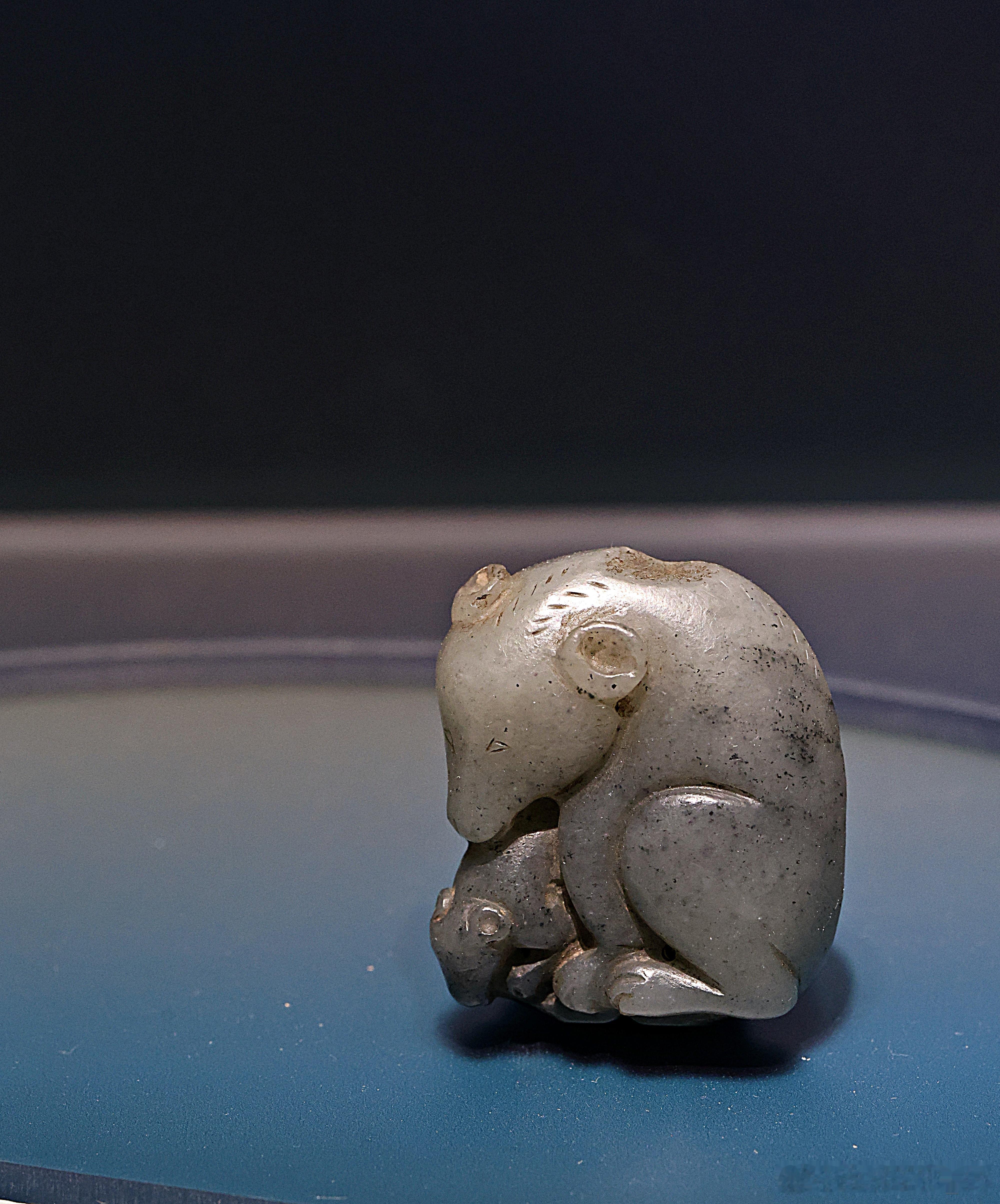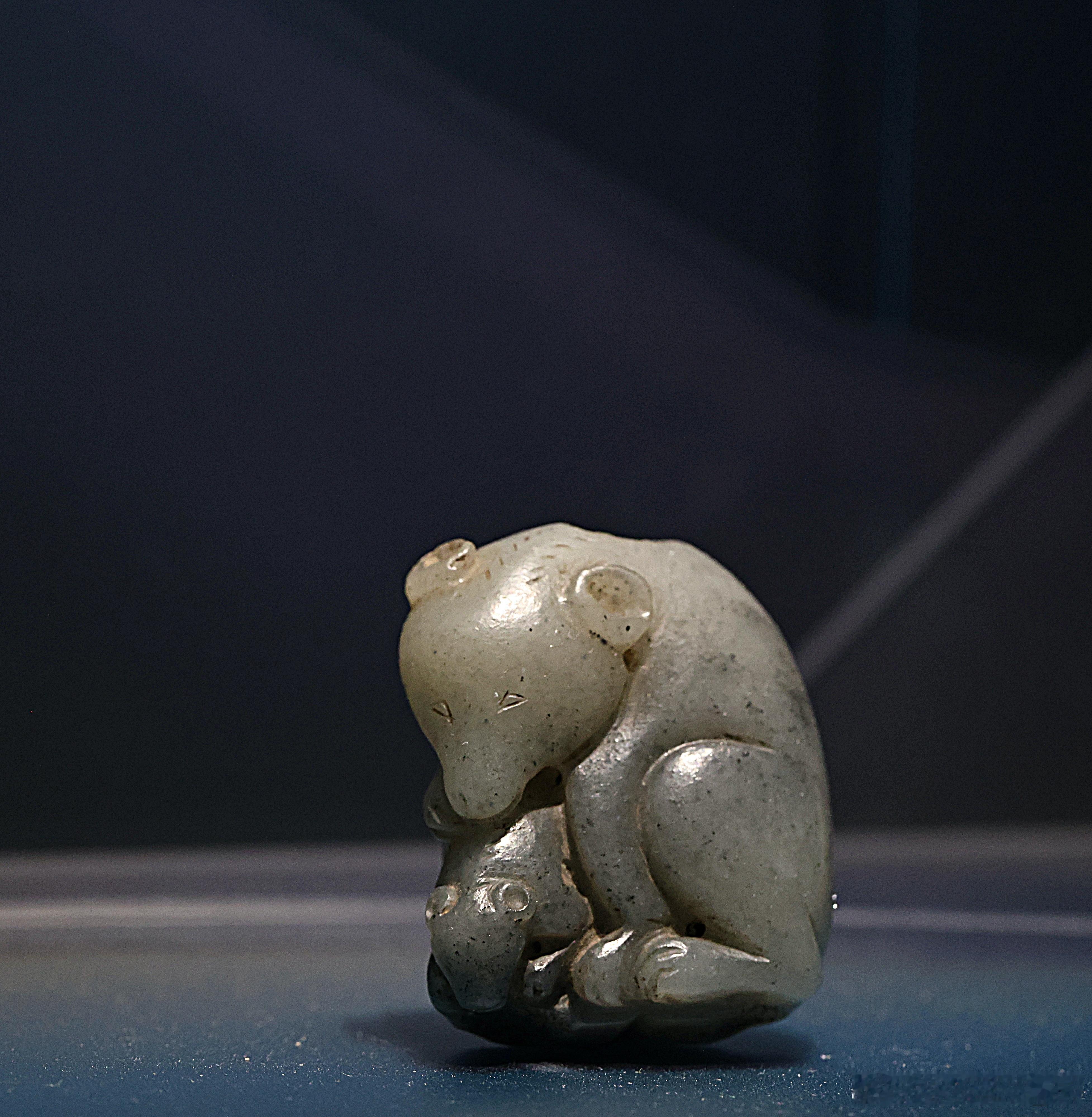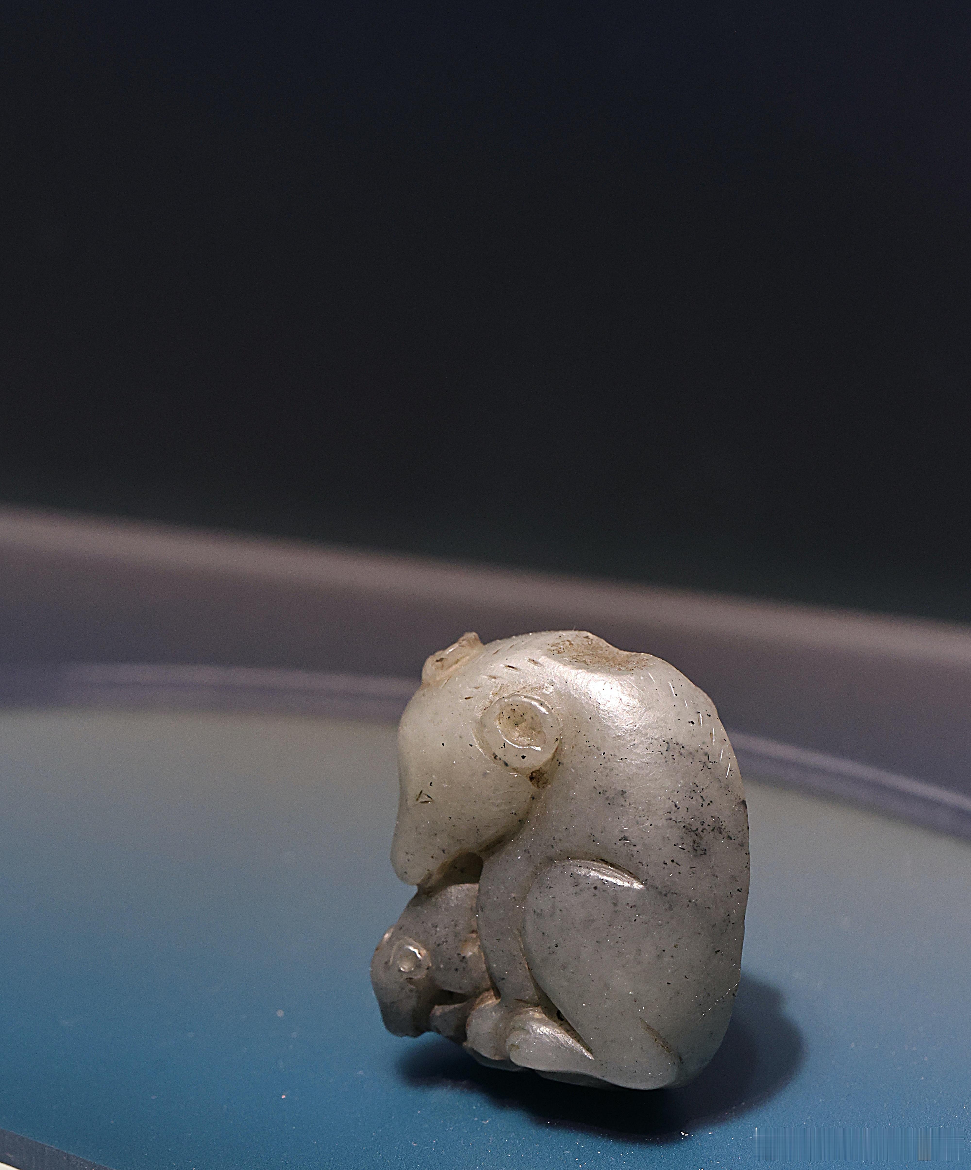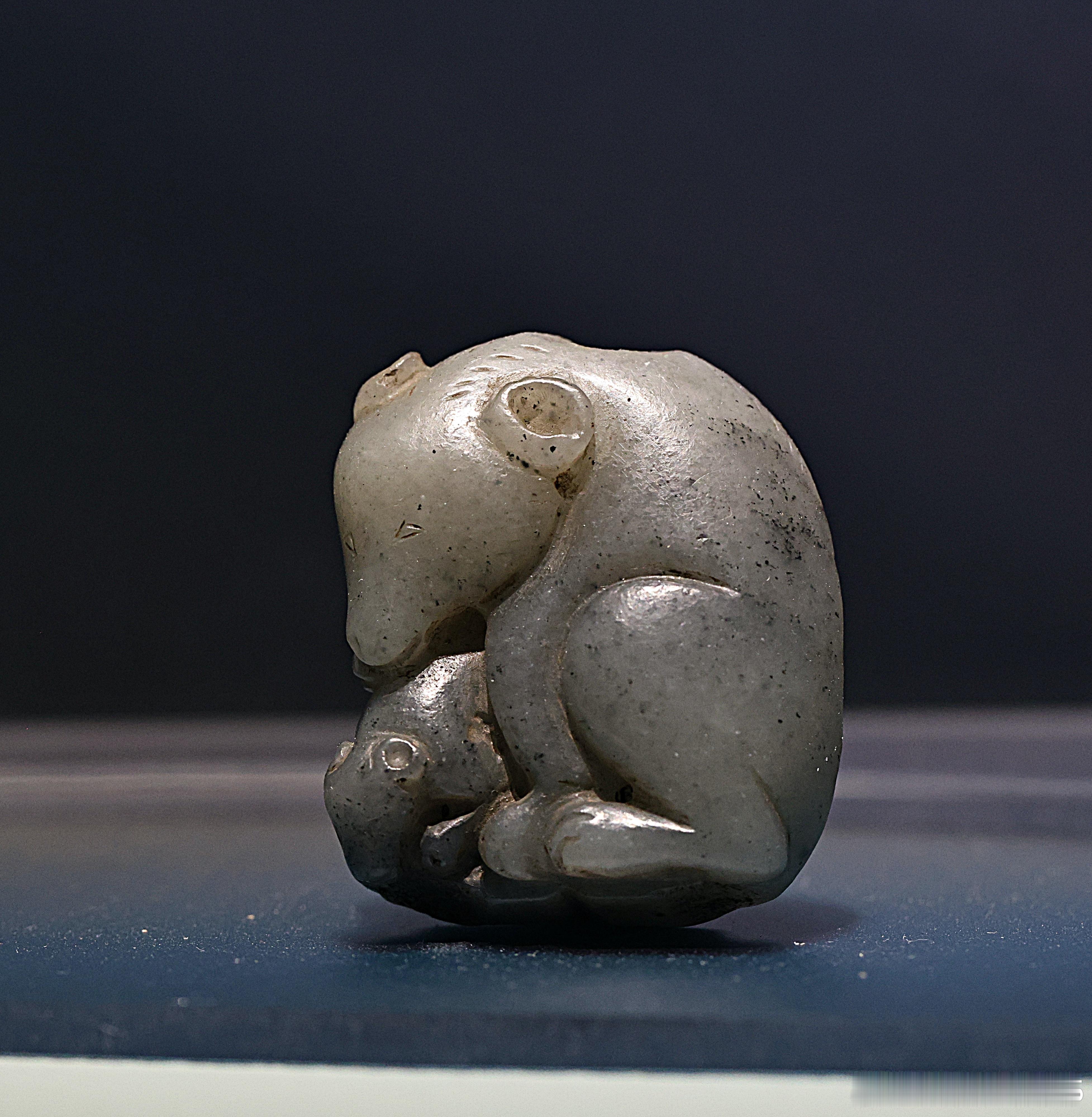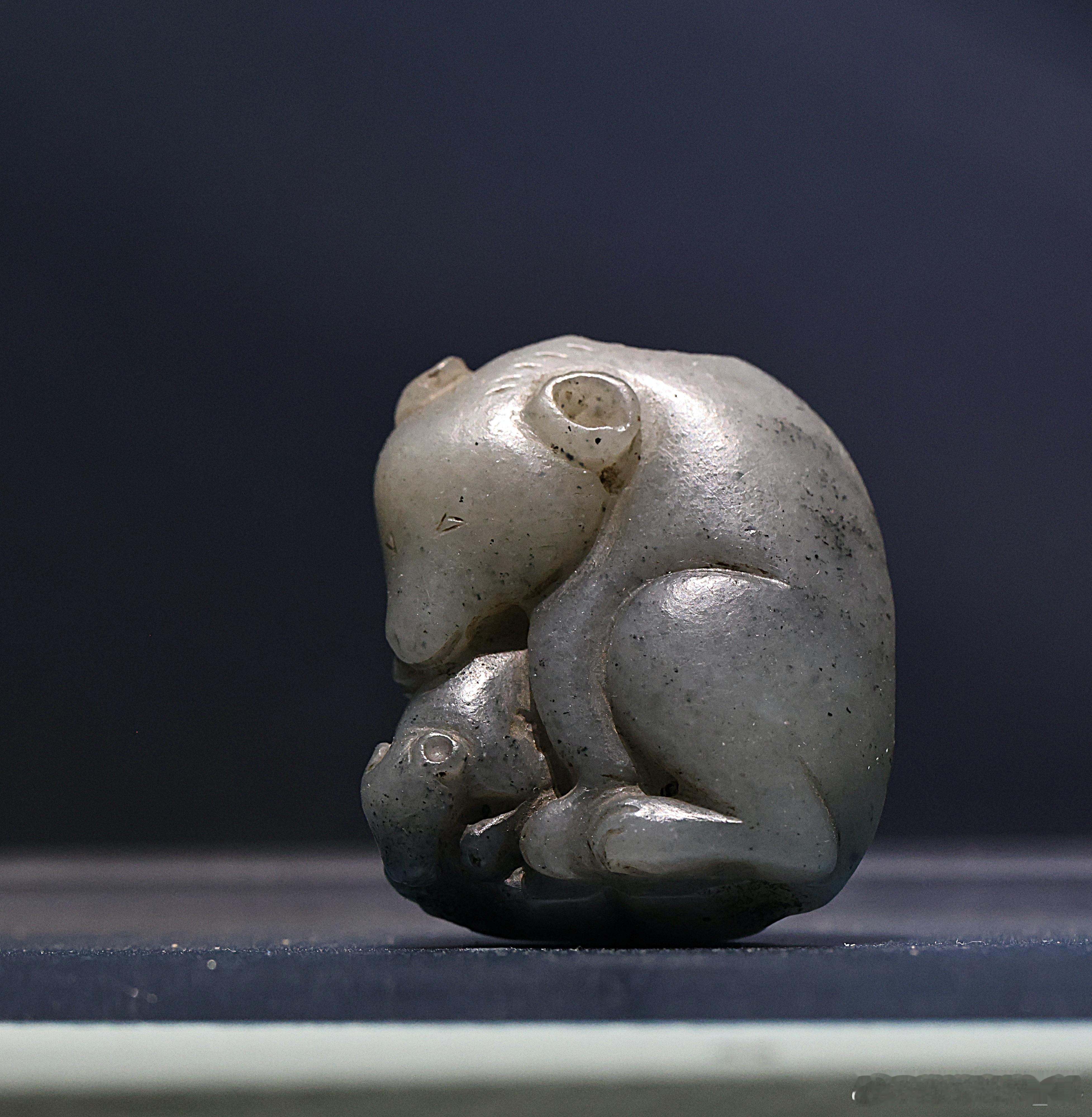 以青玉雕琢而成,呈现出一只母熊俯身怀抱幼熊的感人姿态,造型憨态可掬、刻画细腻传神。此类玉饰件反映了金元时期玉雕工艺的精湛水准,也蕴含着对生命繁衍、母子情深的美好寄望。熊作为力量的象征,在此刻被赋予温暖亲情,是研究古代玉器艺术与民俗文化的重要实物资料。
