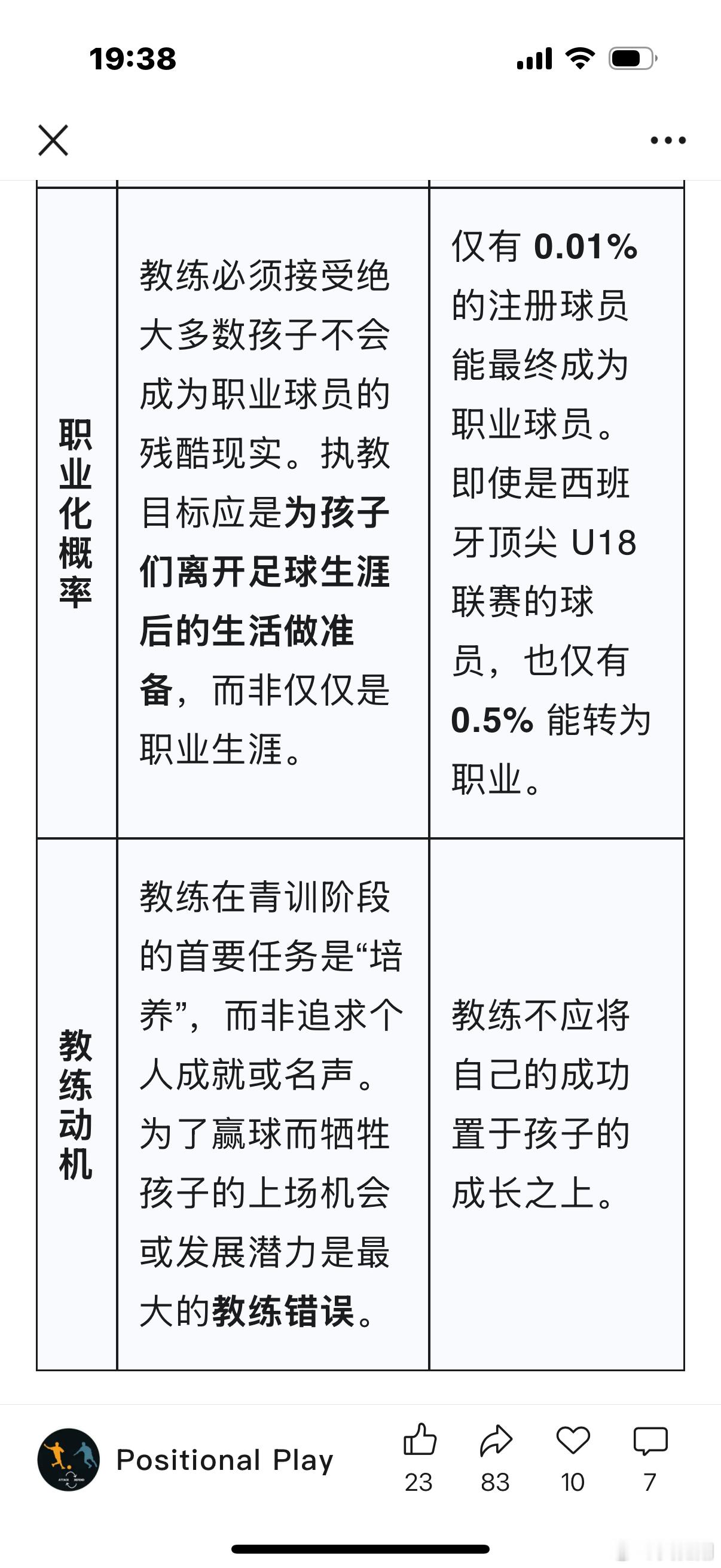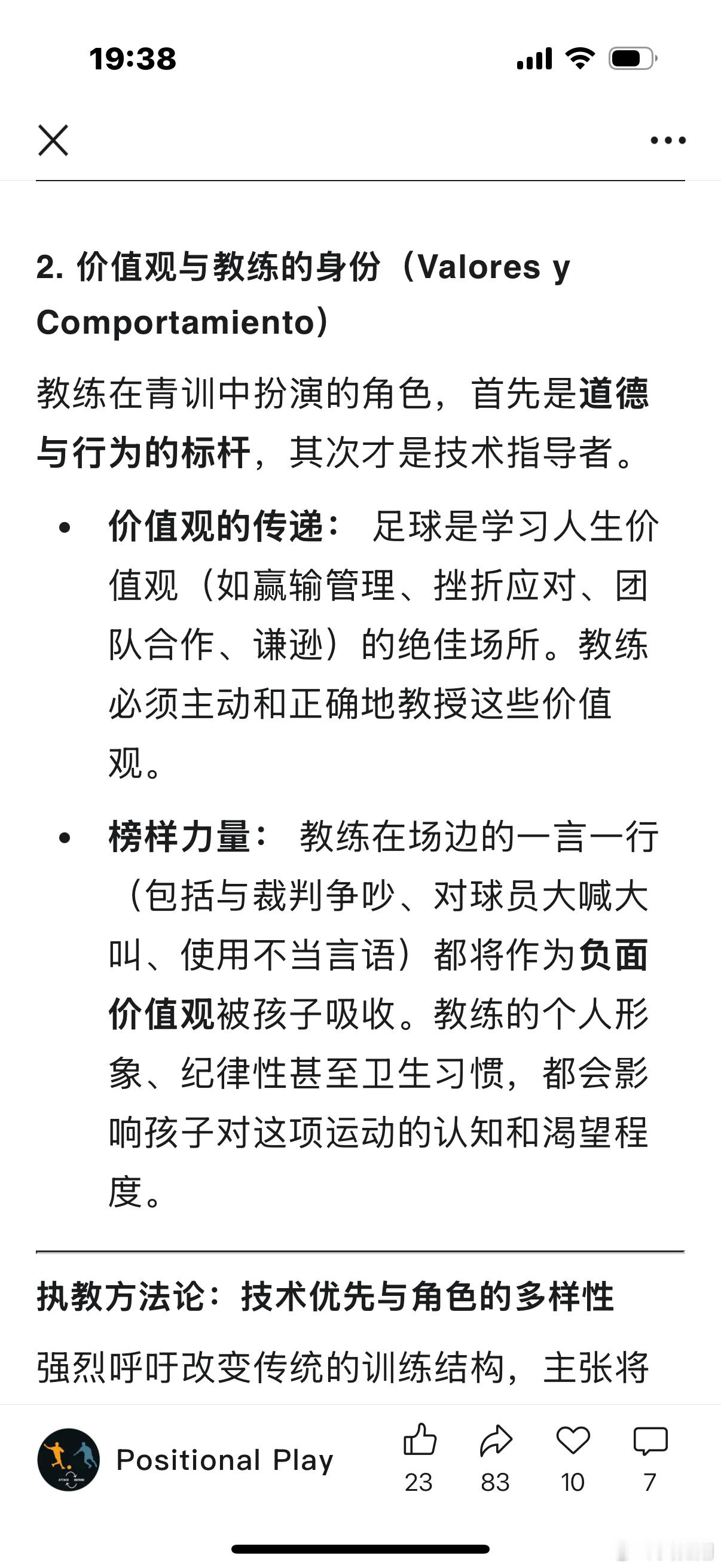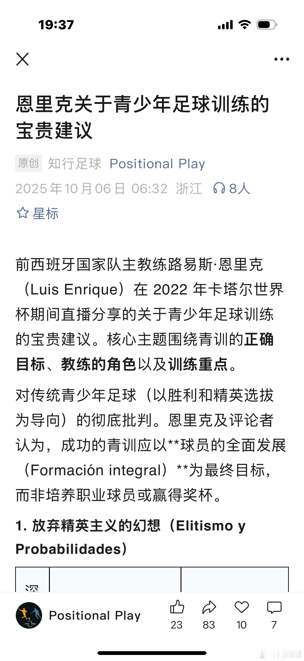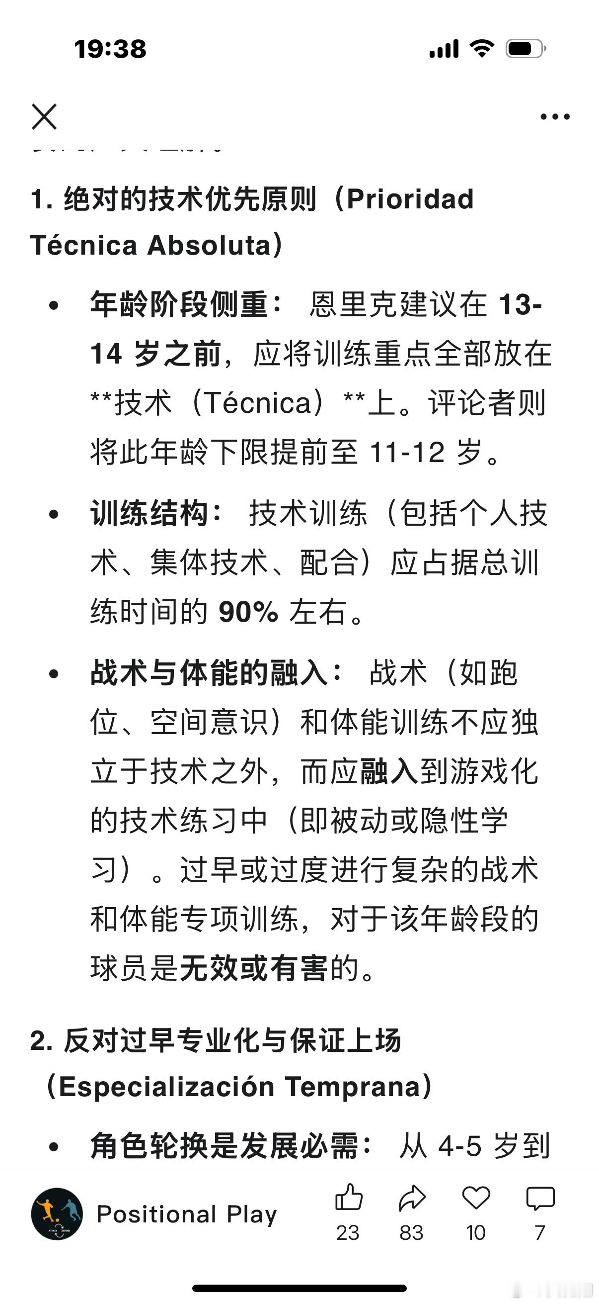 前西班牙国家队主教练路易斯·恩里克(Luis Enrique)在 2022 年卡塔尔世界杯期间直播分享的关于青少年足球训练的宝贵建议。核心主题围绕青训的正确目标、教练的角色以及训练重点。对传统青少年足球(以胜利和精英选拔为导向)的彻底批判。恩里克及评论者认为,成功的青训应以**球员的全面发展(Formación integral)**为最终目标,而非培养职业球员或赢得奖杯。1. 放弃精英主义的幻想(Elitismo y Probabilidades)深度分析点观点提炼关键数据支持职业化概率教练必须接受绝大多数孩子不会成为职业球员的残酷现实。执教目标应是为孩子们离开足球生涯后的生活做准备,而非仅仅是职业生涯。仅有 0.01% 的注册球员能最终成为职业球员。即使是西班牙顶尖 U18 联赛的球员,也仅有 0.5% 能转为职业。教练动机教练在青训阶段的首要任务是“培养”,而非追求个人成就或名声。为了赢球而牺牲孩子的上场机会或发展潜力是最大的教练错误。教练不应将自己的成功置于孩子的成长之上。2. 价值观与教练的身份(Valores y Comportamiento)教练在青训中扮演的角色,首先是道德与行为的标杆,其次才是技术指导者。价值观的传递: 足球是学习人生价值观(如赢输管理、挫折应对、团队合作、谦逊)的绝佳场所。教练必须主动和正确地教授这些价值观。榜样力量: 教练在场边的一言一行(包括与裁判争吵、对球员大喊大叫、使用不当言语)都将作为负面价值观被孩子吸收。教练的个人形象、纪律性甚至卫生习惯,都会影响孩子对这项运动的认知和渴望程度。执教方法论:技术优先与角色的多样性强烈呼吁改变传统的训练结构,主张将训练资源集中于球员的技术基础和对比赛的广义理解。1. 绝对的技术优先原则(Prioridad Técnica Absoluta)年龄阶段侧重: 恩里克建议在 13-14 岁之前,应将训练重点全部放在**技术(Técnica)**上。评论者则将此年龄下限提前至 11-12 岁。训练结构: 技术训练(包括个人技术、集体技术、配合)应占据总训练时间的 90% 左右。战术与体能的融入: 战术(如跑位、空间意识)和体能训练不应独立于技术之外,而应融入到游戏化的技术练习中(即被动或隐性学习)。过早或过度进行复杂的战术和体能专项训练,对于该年龄段的球员是无效或有害的。2. 反对过早专业化与保证上场(Especialización Temprana)角色轮换是发展必需: 从 4-5 岁到 12-13 岁,孩子必须在所有位置上进行尝试,包括守门员、后卫和前锋。理解比赛: 只有体验过所有角色的困难和视角,球员才能在战术上理解比赛的整体性,培养正确的身体姿态和面向球场的意识。降低风险: 运动科学研究支持,过早的专项化与未来更严重的运动损伤风险呈正相关。均衡的经历: 球员的培养需要体验所有角色:首发、替补、未入选、队长。长期担任单一角色(如永远的首发或永远的替补)都会限制球员的心智发展和对团队角色的理解。对家长的行为规范(Guía para Padres)恩里克呼吁家长将自己视为支持者,而非次级教练,以最大程度减少外部压力。深度分析点建议行为行为分析沟通重点比赛后,不问比分或表现,而问:“你玩得开心吗?”和“你是否竭尽全力了?”专注于孩子的内部感受和努力,而非外部结果,将体育活动的主导权归还给孩子。压力与纪律家长应理解错误是学习的一部分,不要因为技术或决策失误而批评孩子。场外的批评是过度要求(Sobreexigencia),它会损害孩子对足球的乐趣,并制造不必要的压力,与必要的**运动纪律(Disciplina deportiva)**是两回事。降级态度如果孩子在精英队伍得不到上场时间,家长应坦然接受降级到更低要求的队伍。上场踢球是发展所必需的。为了“面子”或虚荣心让孩子在场边枯坐,是阻碍其发展的错误决定。