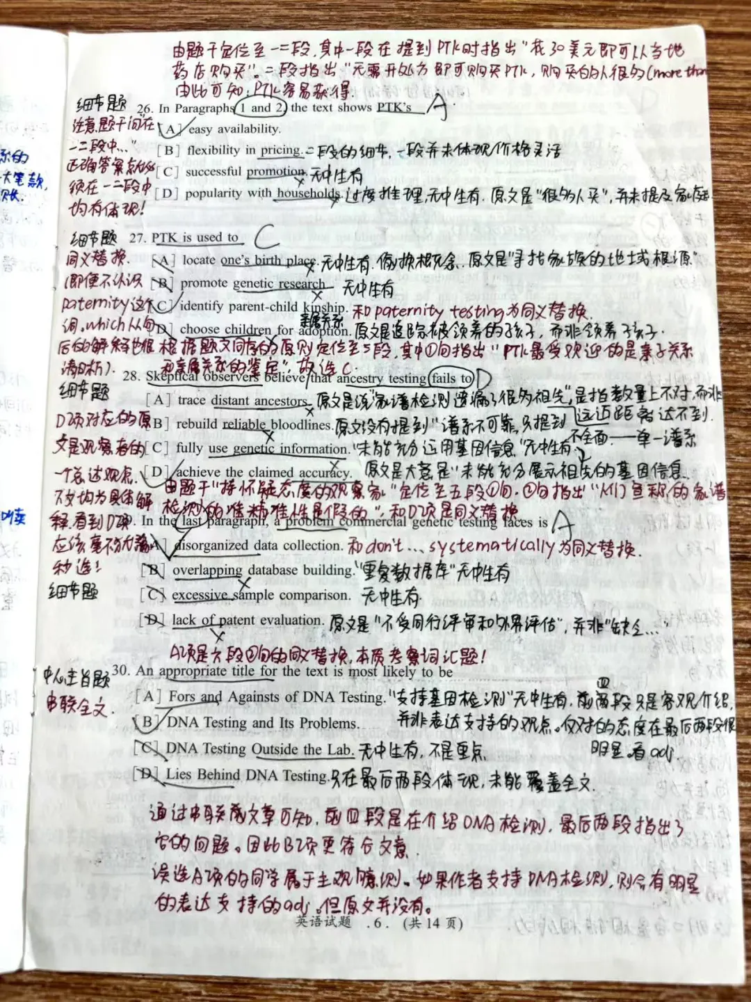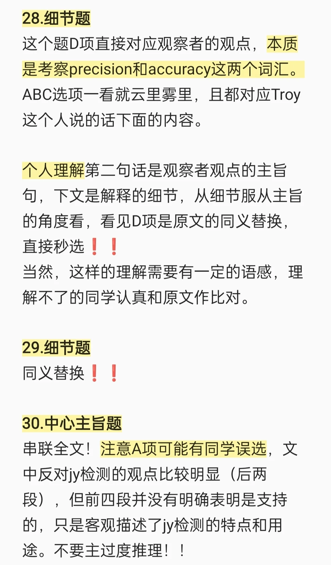 串联全文!注意A项可能有同学误选,文中反对jy检测的观点比较明显(后两段),但前四段并没有明确表明是支持的,只是客观描述了jy检测的特点和用途。不要主过度推理!!