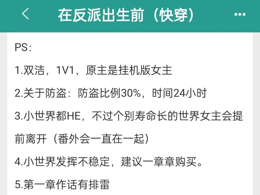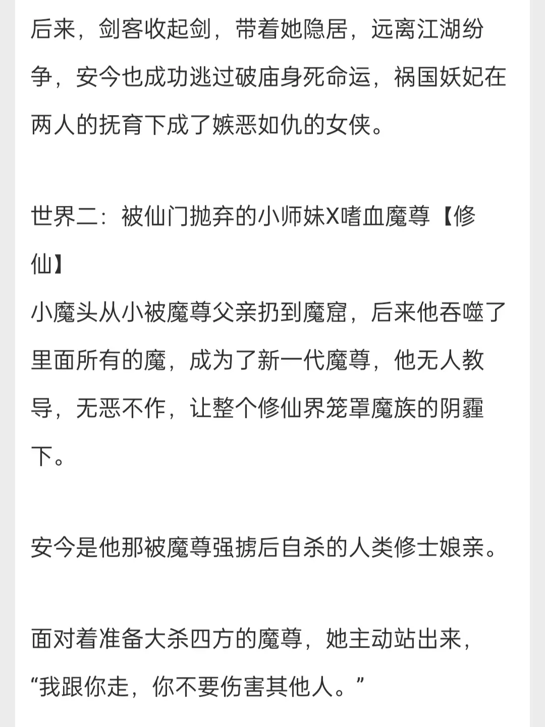 我真的好喜欢这本快穿,剧情节奏很顺畅,也没有恶毒女配(这点我最喜欢,无脑雌竞要不得)。情节繁简度非常舒服,我想看哪里大大就写哪里,深得我心!!! 女主人设淡淡的却有种美好的感觉。女主穿到每一个世界和男主相遇相识也都是她本人,不存在是原主接触的男主然后女主接盘。 每个故事都好喜欢,看的我停不下来。(就是快穿世界古代占比较多,要是能有点未来末世什么就好了)