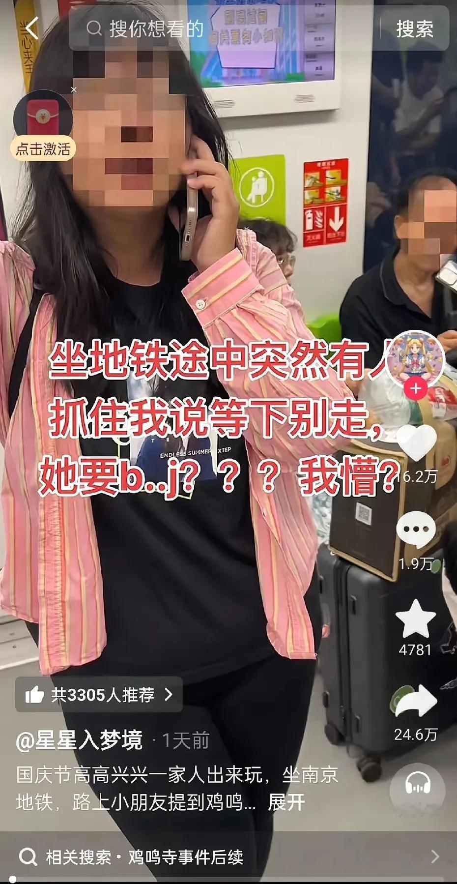 地铁车厢里,有人随口提“鸡鸣寺”,女子突然跳起来指着对方骂脏话。 好好的通勤