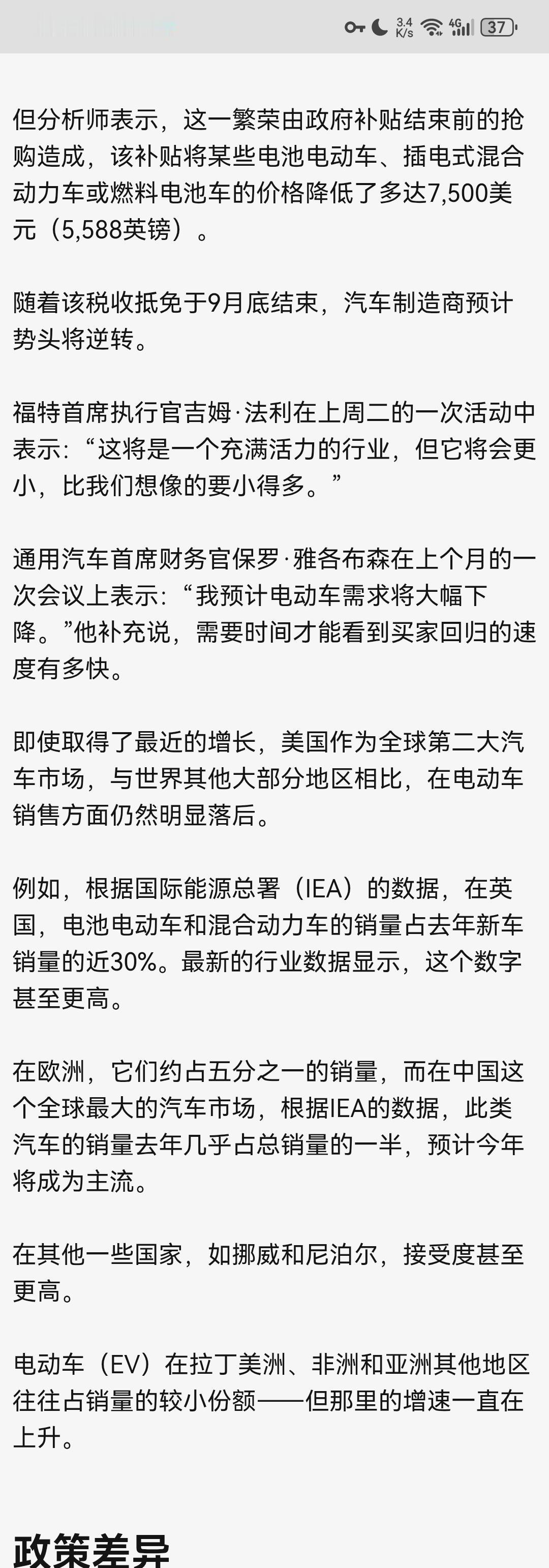 外媒竟然开始反思了!根据BBC中文网10月6日的报道,美国曾经是新能源电动车行业的引领者,特斯拉直到现在都仍旧是新能源电动车行业的头号霸主,但在这表面的繁荣之下,隐藏着的却是另一种景象,那就是新能源电动车在美国日渐遇冷,渗透率低于中国就不说了,甚至连欧洲都比不上,以至于现在的真实现状就是,美国已经在全球新能源电动车的竞赛中落后! 为什么之前美国的新能源电动车行业曾经领先,现在却落后了?BBC对这一点进行了反思,然后指出,其原因主要有两点。 第一,是美国政府现在对新能源电动车的支持力度大大降低。之前,美国为了发展这个行业,出台了很多补贴措施,各种补贴加起来能够让一台新能源电动车的价格降低7500美元,与此同时,政府还会专门出资修建充电桩等基础设施,以求新能源电动车能够更快普及,可是现在随着特朗普上台,这些补贴扶助措施,都在一一取消。 取消补贴措施也就罢了,让美国的新能源电动车行业更加雪上加霜的是,特朗普还大力发展石油天然气等行业,使得美国的汽油等能源的价格更具有竞争力,同时还设置贸易壁垒,禁止其他国家更具有价格竞争力的新能源电动车进入美国市场,两者结合之下,使得新能源电动车在美国的价格普遍比较高昂,竞争力远远低于油车。 根据数据统计,美国电动车的平均交易价格甚至超过了57000美元,比正常汽车的平均价格高出16%! 第二,则是美国制造业空心化导致电动车的生产成本一直居高不下。美国的制造业外流严重,即便是马斯克这样的天降神人,也是依靠上海的特斯拉工厂,才能够生产出足够的电动车,特斯拉之前成功了,可其他的汽车企业在眼下这个比较复杂的国际环境中,显然已经无法复制特斯拉的道路,因此通用、福特等美国传统汽车制造商,都已经缩减对电动车的投入。 投入缩减,未来美国的电动车自然只会越来越衰弱。 美国这样的情况,在全球都是异类,BBC的报道指出,虽然发展过程有着颇多挫折,但是全球诸多国家都在努力发展电动车,像是在英国,电动车的销量已经占全部汽车的1/3,在欧盟,电动车销量也已经占全部汽车销量的1/5,而且这个占比还在继续提升。 即便是拉丁美洲、非洲、东南亚等地区,电动车的销量也一直都在提升。 全球电动车都在飞速发展,美国电动车却在不断衰落,毫无疑问,这样的情况若是持续下去,未来美国在汽车行业的话语权将受到无比惨重的打击,彻底失去存在感。汽车工业号称工业之王,若是一个大国没有一个强大的汽车工业,那么也就不足以称之为大国,在汽车工业的落后,长远来看,对于美国国力的负面影响,将是无比深远的。 BBC这篇报道,反思了美国电动车逐渐衰落的整个过程,最后却也感到无奈,即便弄清楚了原因,但也很难改变什么,这个衰落趋势,几乎是注定的。